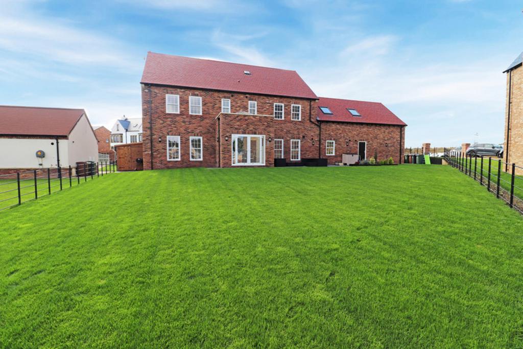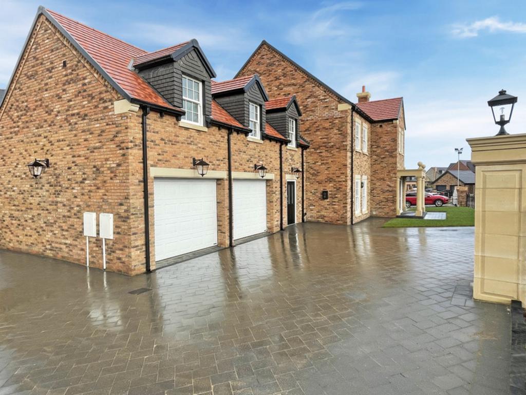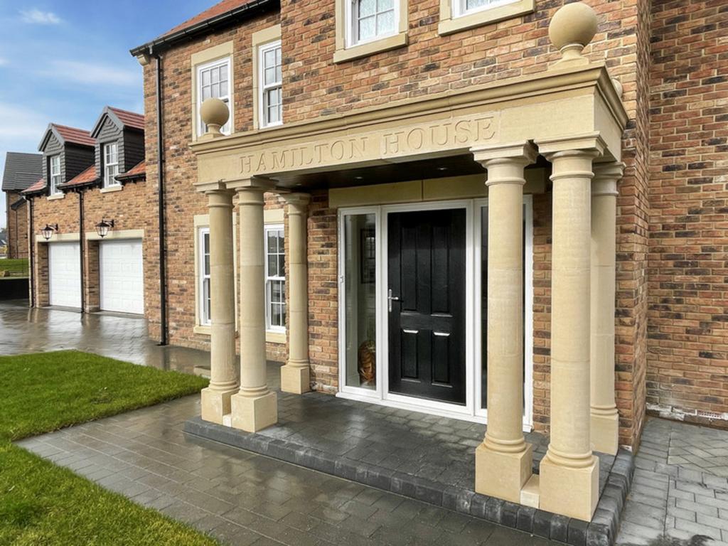 The property is rich in curb appeal, featuring a stone portico main entrance with ‘Hamilton House’ engraved into the façade, surrounding the grand 1m wide doorway. A large double garage compliments the home, complete with fully tiled floor, two EV car charging points and Hornmann Sectional electric doors. There’s a large block paved driveway to the front, with stone pillars and coach lights delivering an impressive welcome, particularly of an evening. The plot is defined with metal estate fencing with a lawn to front and rear.