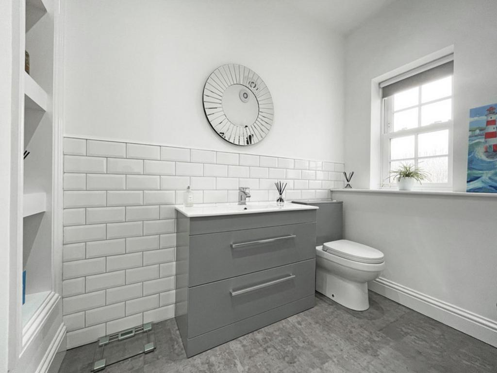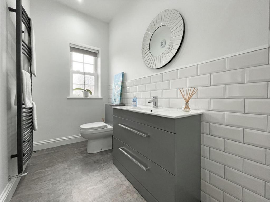 The hallway is complimented by a guest WC, with low flush, modern grey vanity unit, underfloor heating and white gloss metro wall tiles.