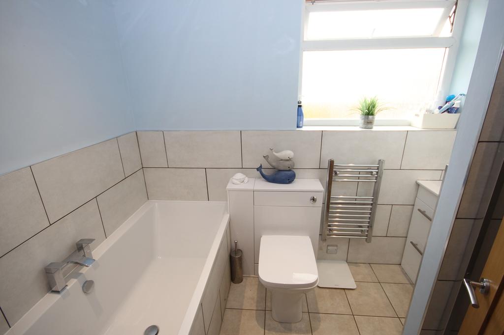 BATH/SHOWER ROOM part-tiled walls, panelled bath, vanity unit, low level WC, separate tiled shower cubicle, medicine cabinet, radiator & uPVC double glazed window.