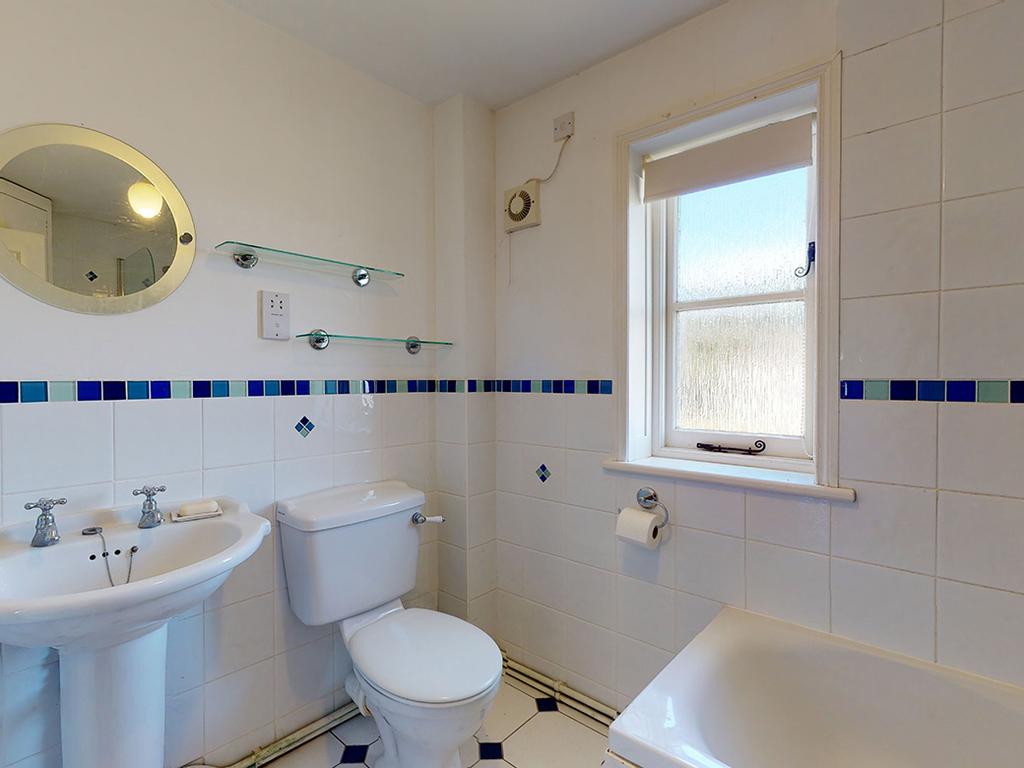 A white suite comprising fitted low level WC, panelled bath, pedestal wash basin, tiling to splash prone areas, exposed painted floor boards, radiator, timber glazed double window to the side, extractor fan.