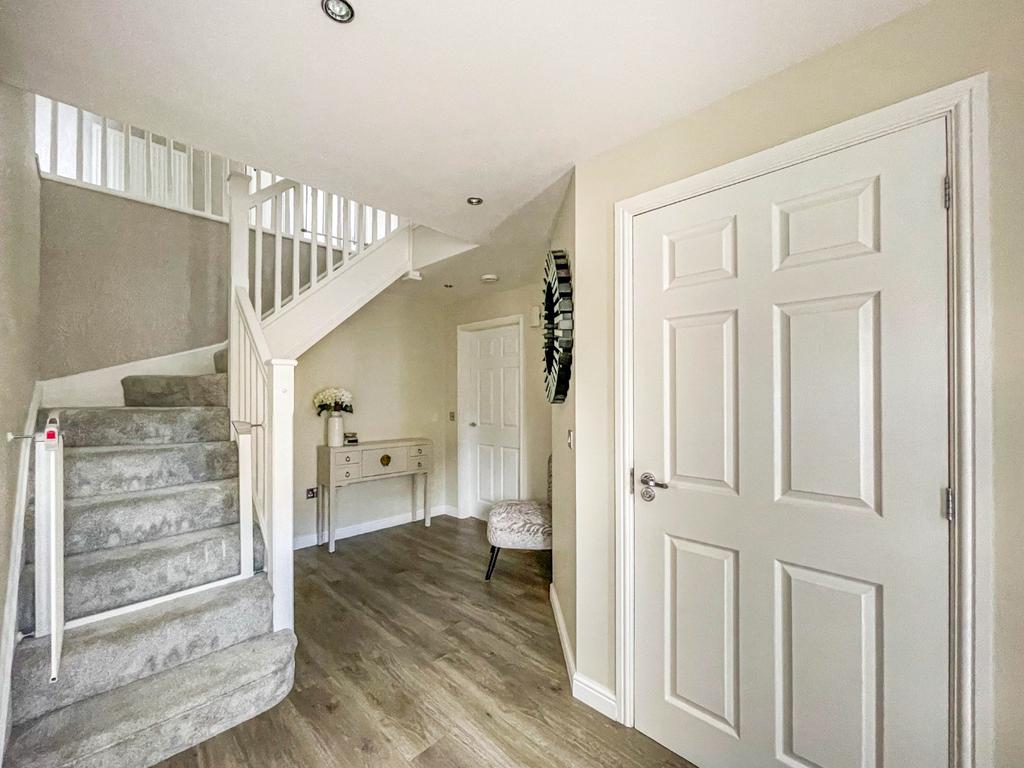 Amtico flooring, radiator, uPVC double glazed window, stairs to first floor, doors to shoe cupboard, door to: