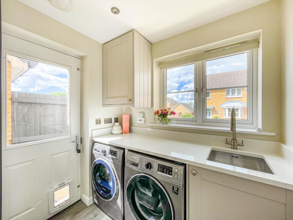 Fitted with a range of wall and base units with worktop over, uPVC double glazed window, stainless steel sink with mixer tap, Amtico flooring, radiator, space for washing machine and dryer, door to pantry, composite door.
