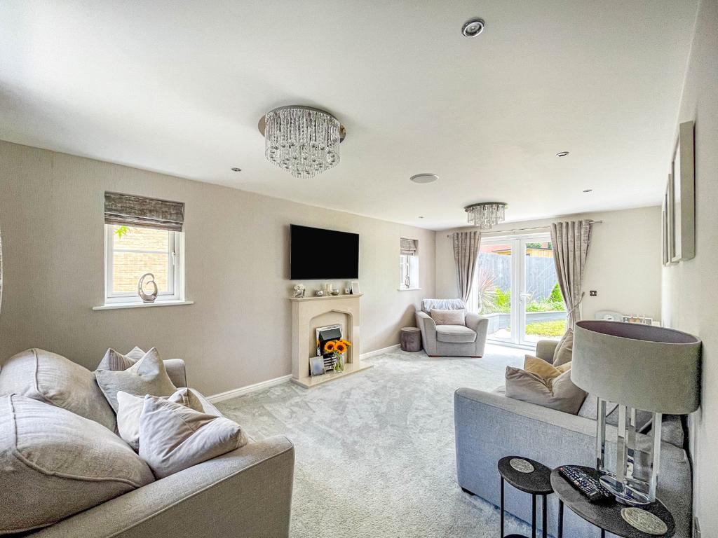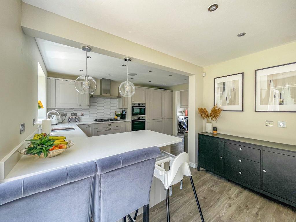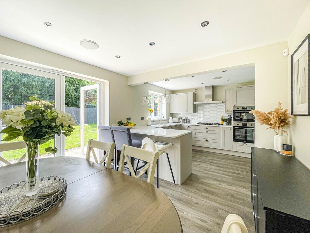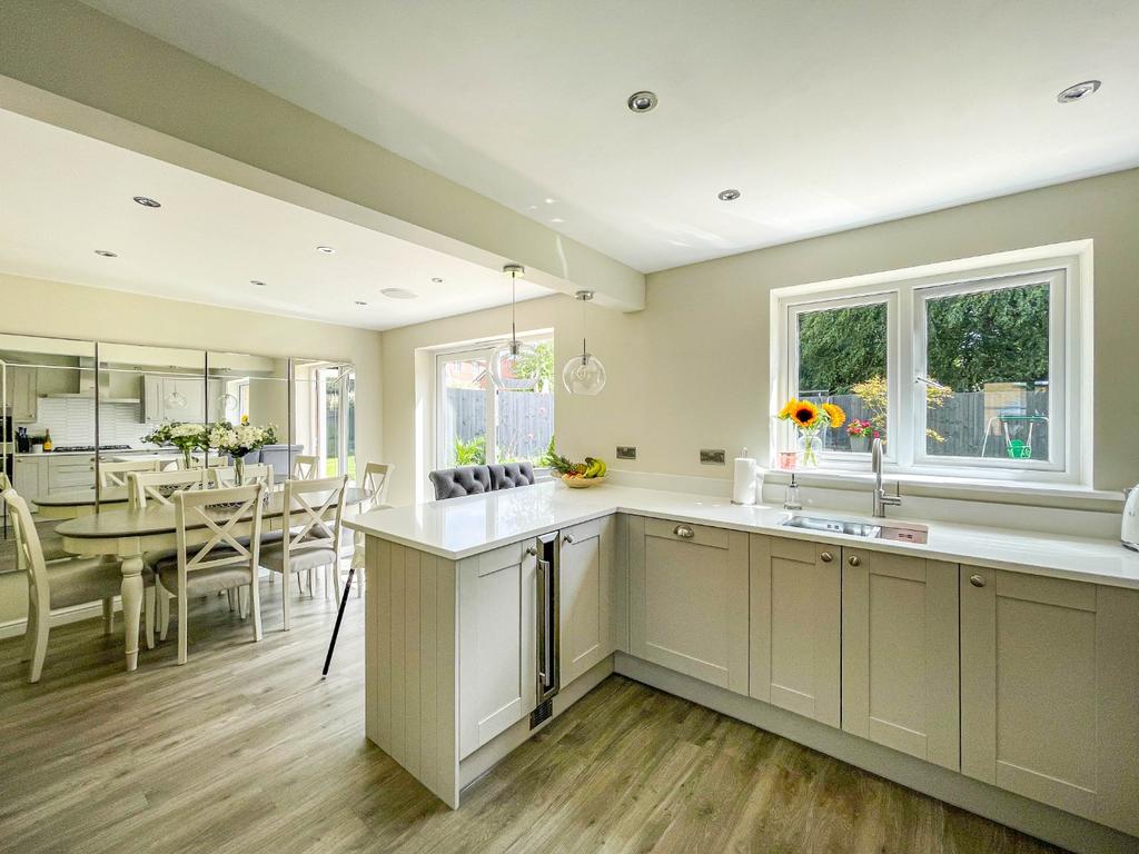 Fitted with a range of modern shaker style wall and base units with Quartz work surface over, integrated dishwasher, integrated fridge/freezer, wine cooler, eye level oven and grill, four ring gas hob with extractor fan over, 1 and 1/2 bowl sink with drainer and mixer tap, radiator, Amtico flooring, uPVC double glazed window, uPVC double glazed patio doors. Opening into: