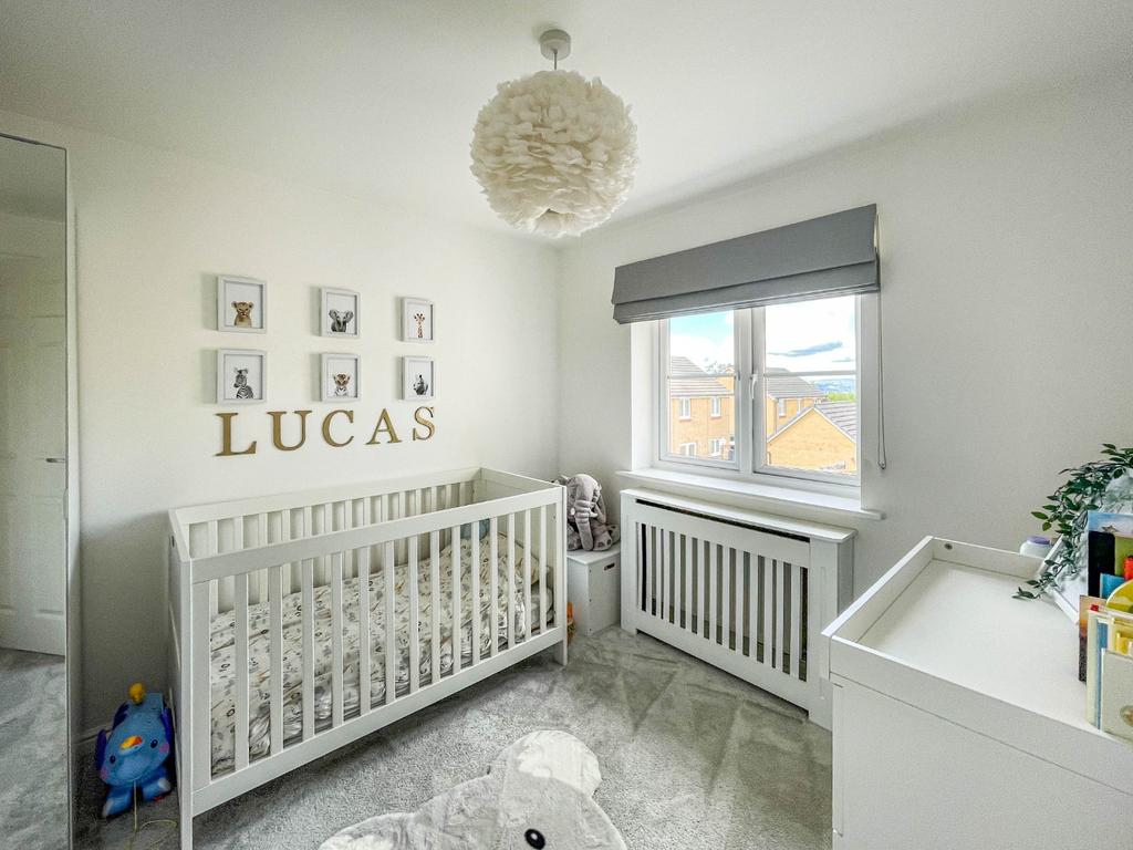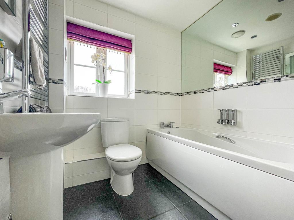 Fitted with a three piece suite comprising of bath, W.C and wash hand basin, tiled walls, tiled floor, heated towel warmer, door to airing cupboard.