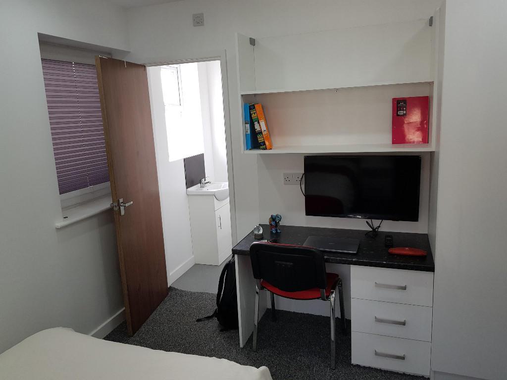 The building is equipped with CCTV security and a secure video entry system for added peace of mind. Each bedroom features a comfortable double bed with memory foam mattress, storage space, fitted wardrobe, mirror, and a smart TV. A fitted desk with drawer and chair, as well as a notice board, provide a perfect study or work space. The spacious bedrooms offer up to 37 Sq M of living space.