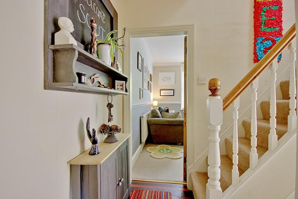 Staircase leading up to the first floor. Door with access down to the cellar. Traditional Edwardian diamond tiled flooring. Ceiling light point and radiator.