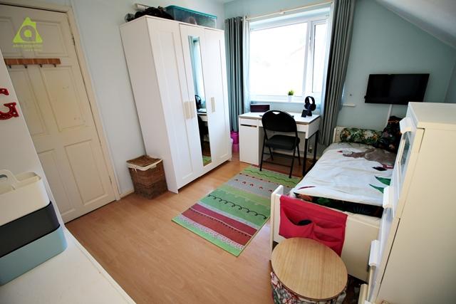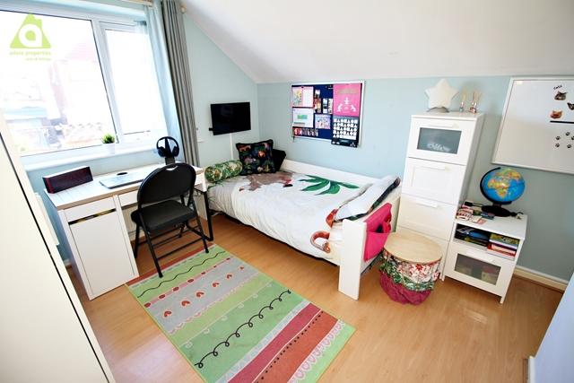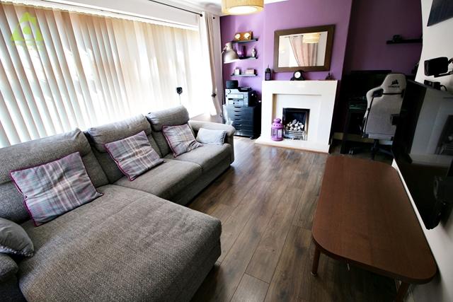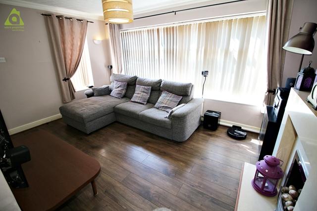 This spacious lounge benefits from a gas fire with marble surround and back and base, double radiator, power points, front facing window, under stairs storage cupboard, Tv point, darkwood laminate flooring, coving and centre ceiling light.