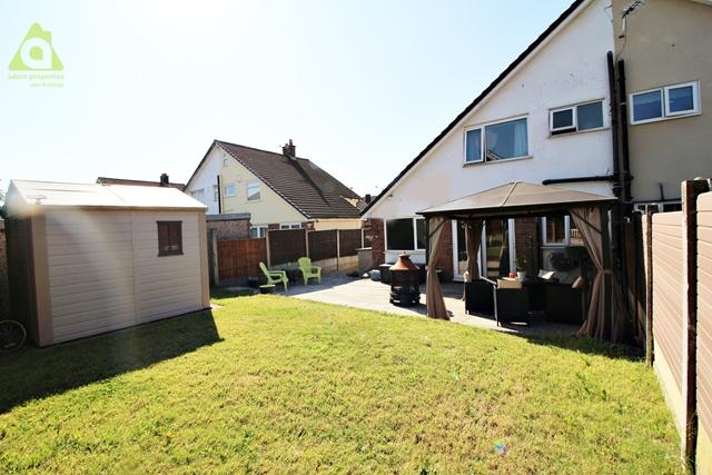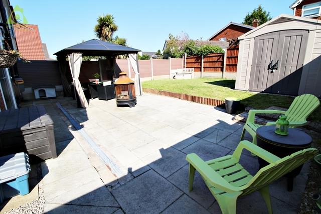 To the rear of the property is a flagged patio area, lawned garden, outside water tap and large plastic shed. Further space is provided down the side of the property offering potential to extend.