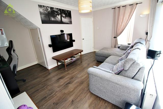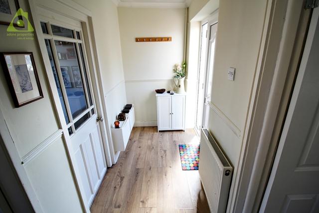 The property is entered via a front facing UPVC door with leaded glass panels. The hallway comprises a front facing window, radiator, power points, dado rail, oak laminate flooring and centre ceiling light.