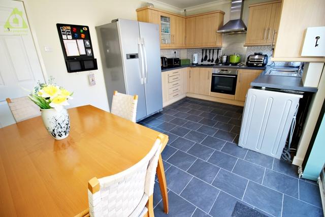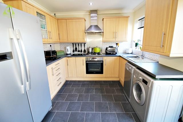 This modern fitted kitchen oak laminate wall and base units complemented by grey roll top work surfaces, one and a half bowl stainless steel sink with mixer taps, mosaic effect splash back tiling, built in electric oven with gas hob, chimney style stainless steel extractor fan with matching stainless steel splash back, space for American style fridge / freezer, plumbing for washing machine and dishwasher, radiator, power points, rear facing window and patio doors, Worcester boiler (controlled by hive thermostat) grey vinyl floor tiles, coving and spot lights.