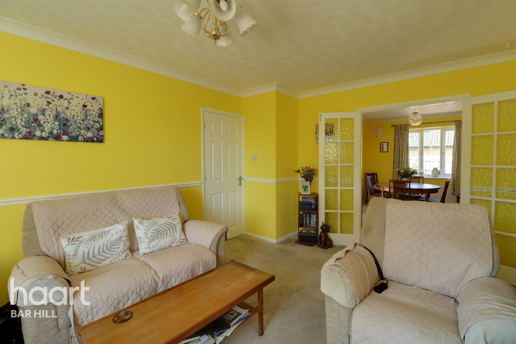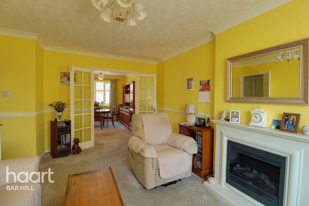 Spacious living room with windows overlooking the front of the property. Double French doors leading to the dining room creating a lovely open feel.