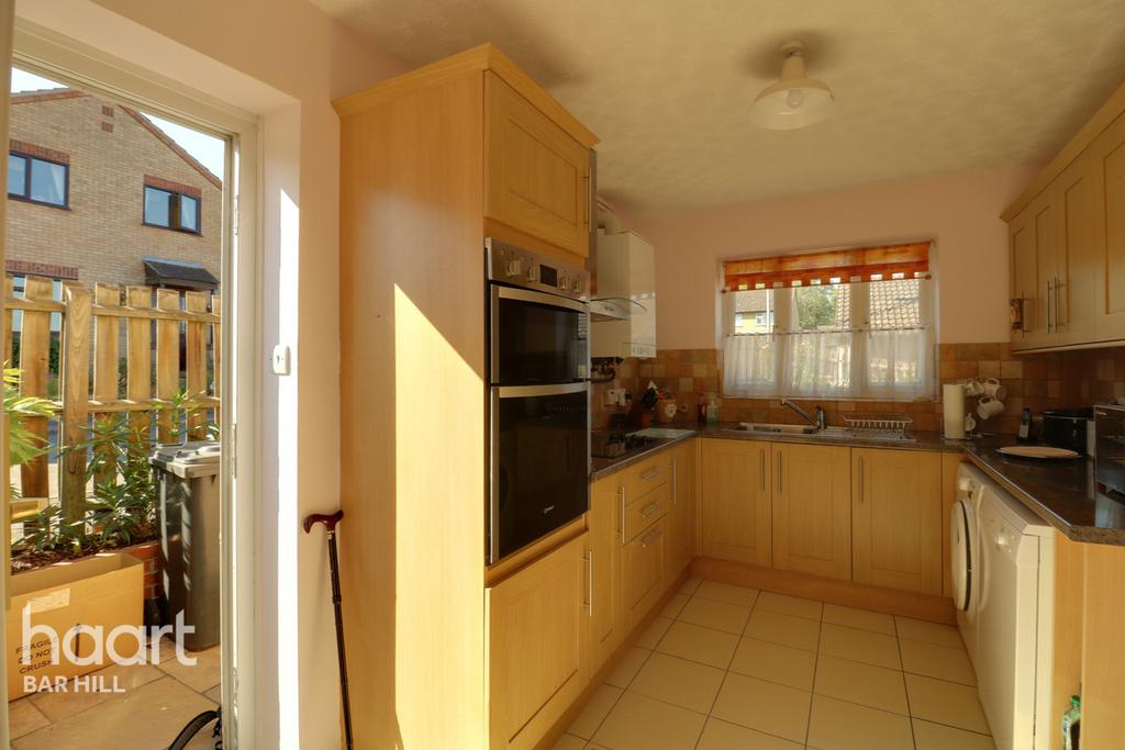 Kitchen compromising of wall and base units, stainless steel sink and draining board, built in Indesit double oven, hob, extractor hood, and Boiler. Windows overlooking the garden, there is also a side door for access to the garden.