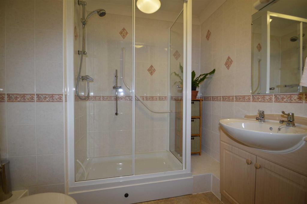 Shower Room - 7'0 x 5'7 - With tile effect vinyl floor covering. Tiled shower cubicle with side glazed splash screen and front sliding glazed doors. Direct feed shower unit. Grab rail. Vanity unit with half inset wash hand basin and cupboard under. Fitted mirror with lighting/shaver socket over. Close coupled WC. Further tiled walls. Electric CREDA fan heater. Wall extractor. ELECTRIC TOWEL RAIL.