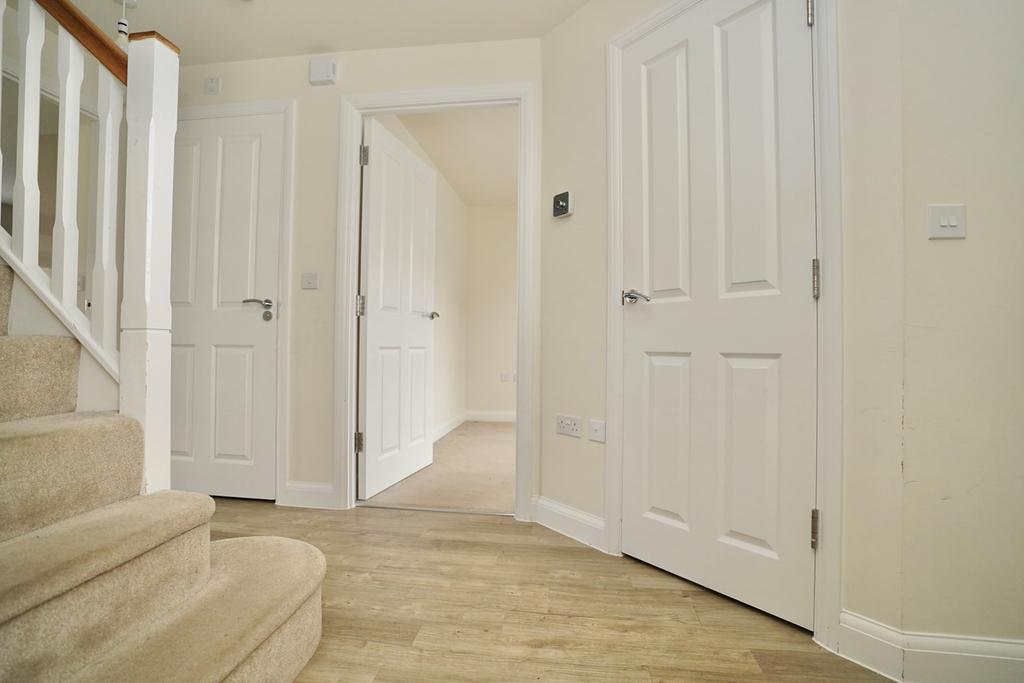 Stairs to first floor, double panel radiator, central heating thermostat, walk in cupboard housing fuse box and master switch, Hive heating system, Karndean flooring.