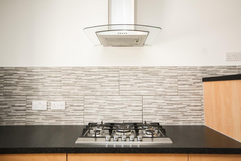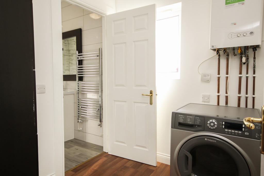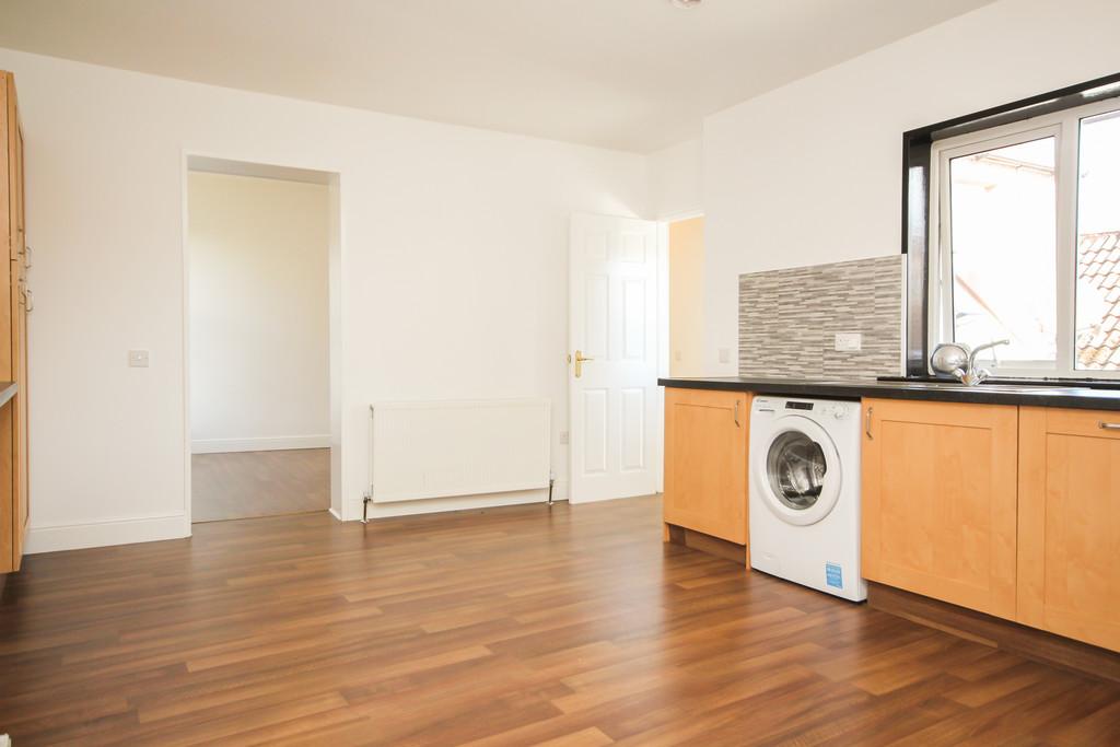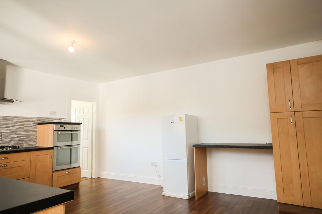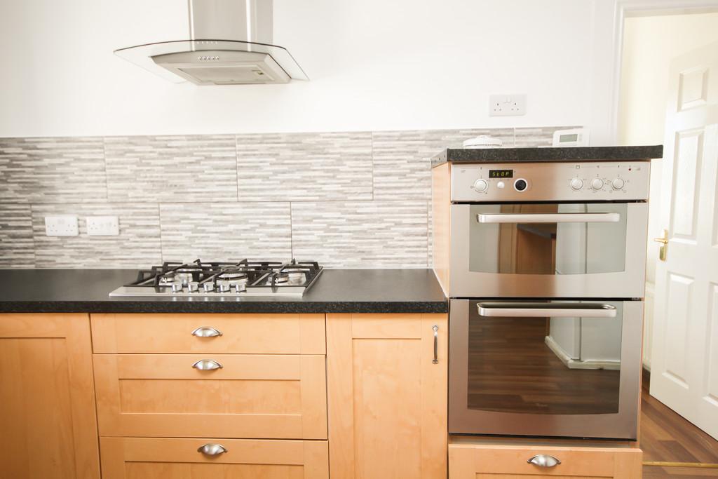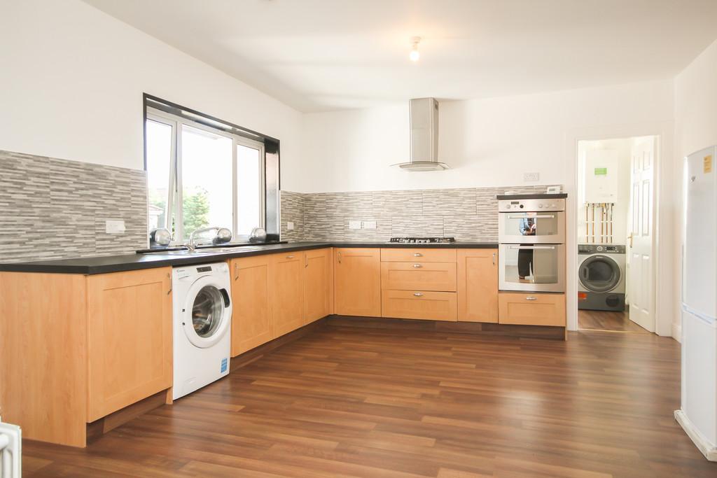 Modern fitted kitchen/diner with gas hob, double oven, fridge, freezer, washing machine and tumble dryer.