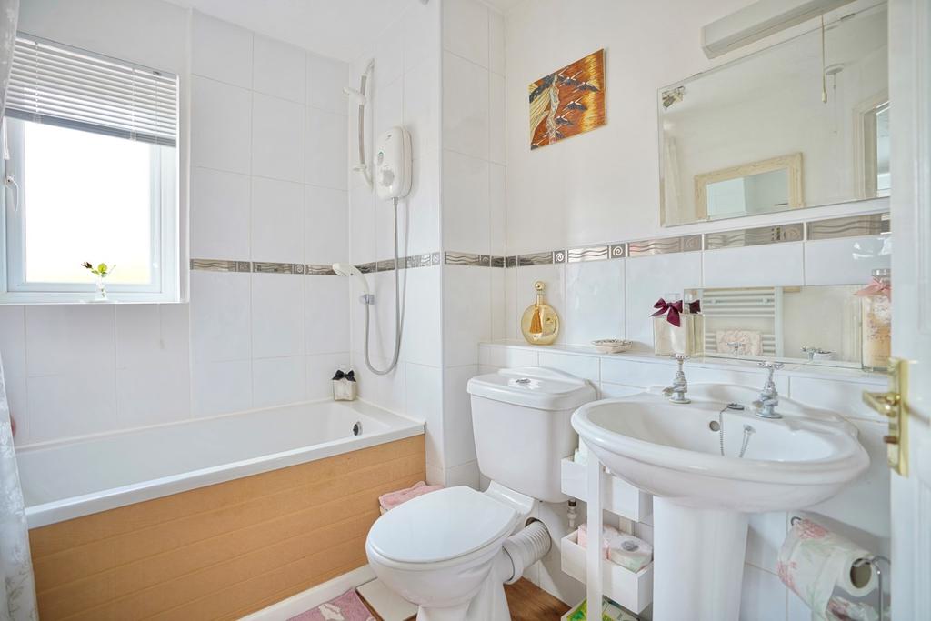Re-fitted in a three piece suite comprising low level WC, panel bath with independent shower unit fitted over, pedestal wash hand basin, heated towel rail, UPVC window to front aspect, Karndean flooring.