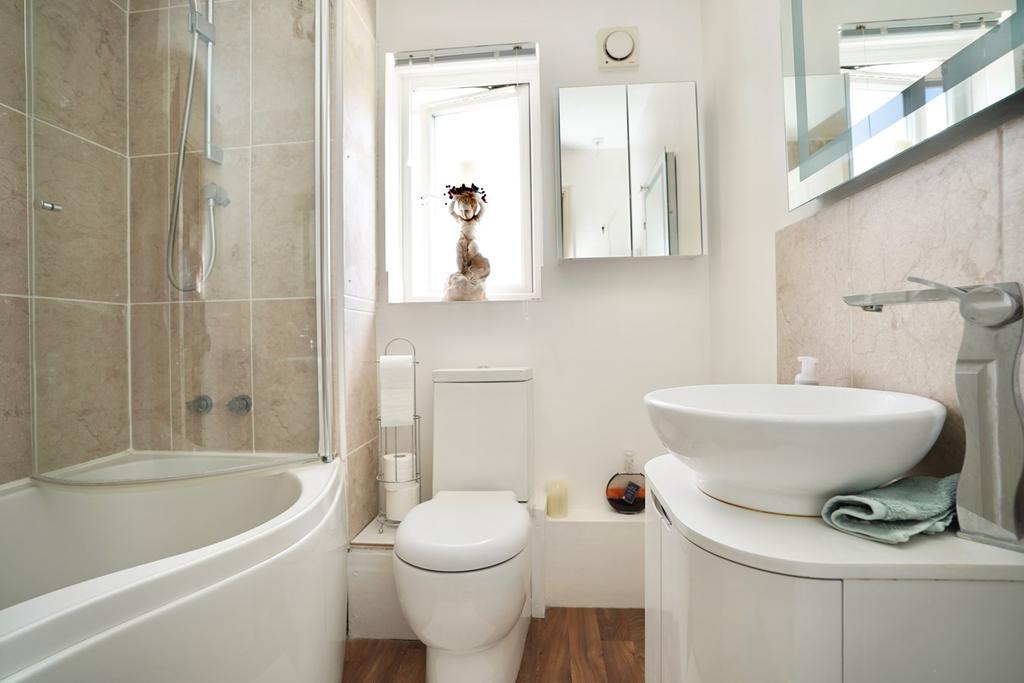 Re-fitted in a three piece suite comprising low level WC, circular surface mounted sink unit with mixer tap, panel bath with folding shower screen and independent shower unit fitted over, UPVC window to garden aspect, Karndean flooring.