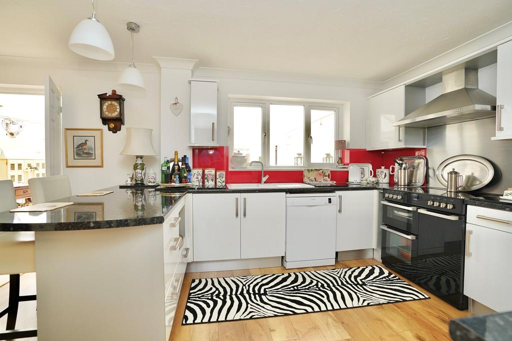 An impressive light contemporary open plan space incorporating dining room, re-fitted in a range of base and wall mounted cabinets with complementing work surfaces and coloured glass splashbacks, central peninsular two stool breakfast bar, double panel radiator, drawer units, plumbing for automatic dishwasher, microwave shelf, pan drawers, UPVC window to garden aspect, space for cooking range (included at the asking price) with suspended stainless steel extractor fitted above, pendant lighting, under unit lighting, inner access to