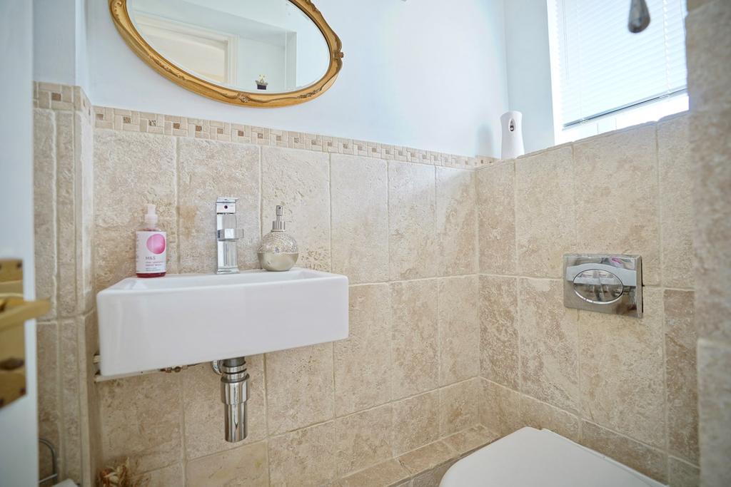 Re-fitted in a two piece contemporary white suite comprising low level wall mounted WC with concealed cistern, wash hand basin, extensive Travertine tiling with natural stone contour border tiling, recessed lighting, UPVC window to front aspect, ceramic tiled flooring.