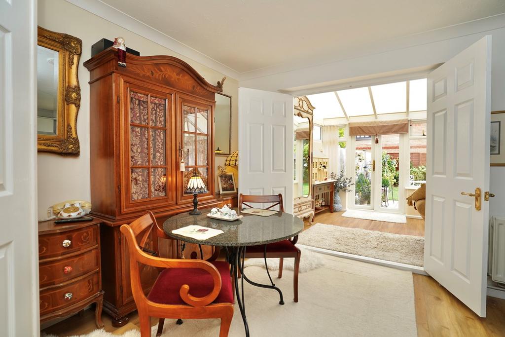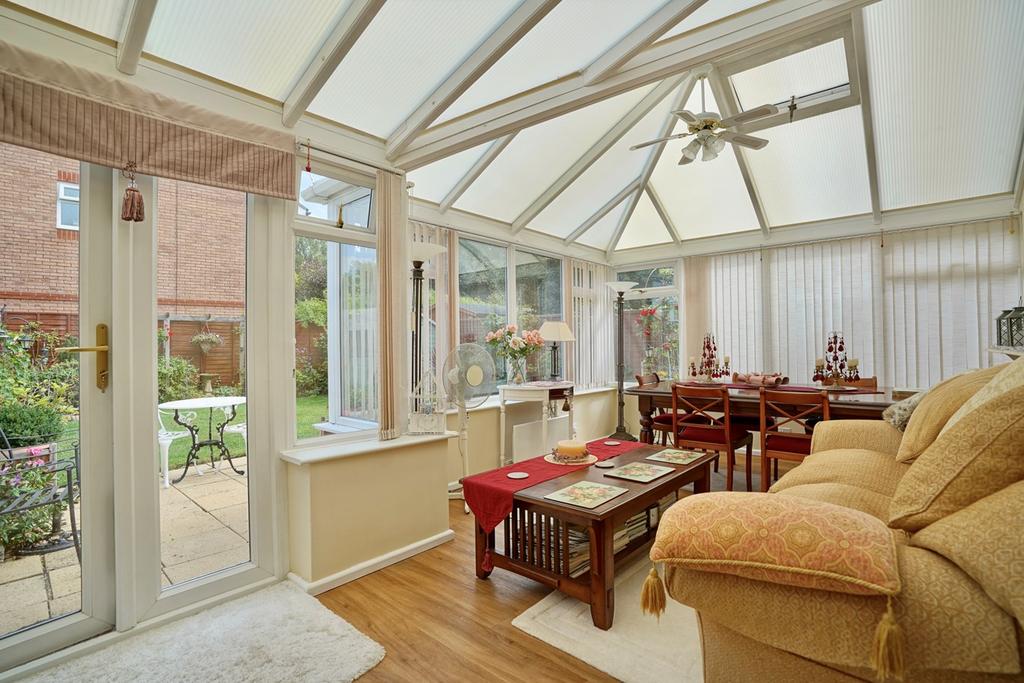 Of brick based UPVC double glazed construction with mono pitch double poly carbonate roofing, French doors access garden terrace to the rear, Karndean flooring.