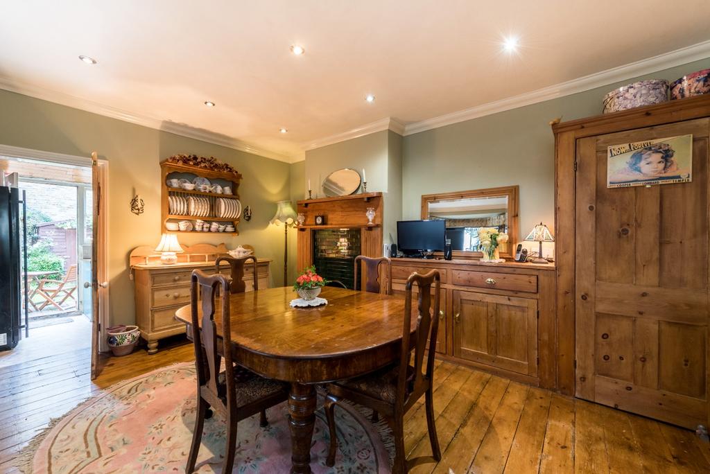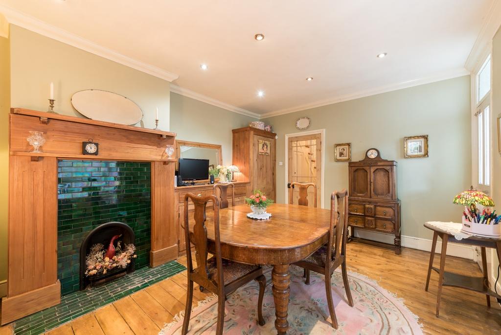 Although large, this room has a slightly more intimate feel. Here, the cornice is less ornate, but still as impressively restored and the ceilings are slightly lower giving more of a cosy cottage feel. There’s an unusual and attractive stripped pine, built-in dresser and storage cupboard to the side of the fireplace, which itself has matching pilasters and mantel with an insert formed from dark green gloss tiles in a traditional offset pattern. There’s a cast iron firebox and the hearth is formed from the same dark green tiles as the insert. Another bay window along with a partially glazed door and transom window leading to the side porch provides plenty of natural light. The walls are decorated in a light sage colour which really complements the stripped pine furniture and floorboards, and lighting is provided by the inclusion of some modern spotlights.