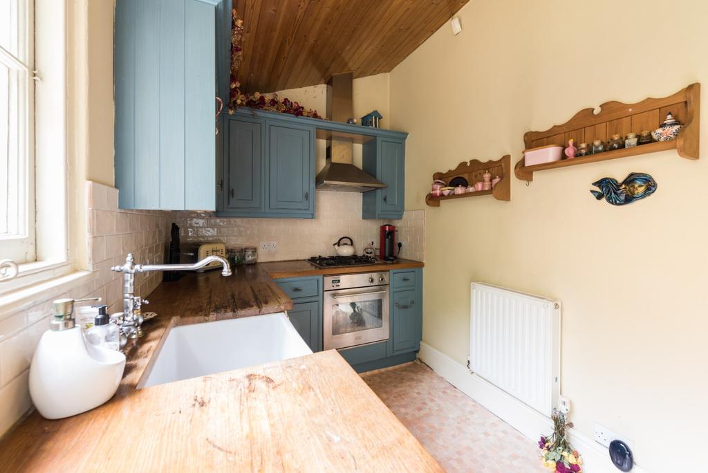 Returning to the dining room, we’ll now pass through the door at the far end which brings you into the lovely cottage-style kitchen. There are shaker style units painted in a classic teal colour, with complementary solid timber work surfaces and a Belfast sink with Victorian style mixer taps sits below the window, allowing a view into the rear garden. An electric oven sits below a gas hob with stainless steel extractor hood, and there’s a radiator, space for a fridge freezer and plumbed in space for a dishwasher. The walls are part-tiled with a gloss cream rippled effect in a horizontal offset pattern, with cream painted walls to match. The sloping ceiling is clad in pine tongue and groove to accentuate the cottage like feel of this space.