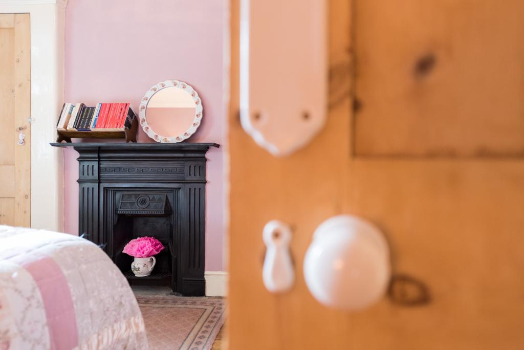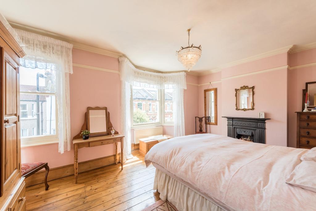 On returning to the landing, you’ll find one last door – into the spectacular main bedroom. Occupying the full width of the house and benefitting from two windows, one of which is the upper bay window from the front façade, this room has generous proportions along with an abundance of natural light. The more ornate cornicing and a picture rail in this room reinforce the almost stately feel of this main bedroom, and the gorgeous cast iron fireplace set within the wide chimney breast would look stunning with a large mirror or statement piece of art placed above. The bay window would be an ideal spot for a chaise longue or comfy armchair to make a cosy reading nook alongside the radiator. There’s ample space for wardrobes, chests of drawers and a dressing table, and the walls are once again decorated in carnation pink.