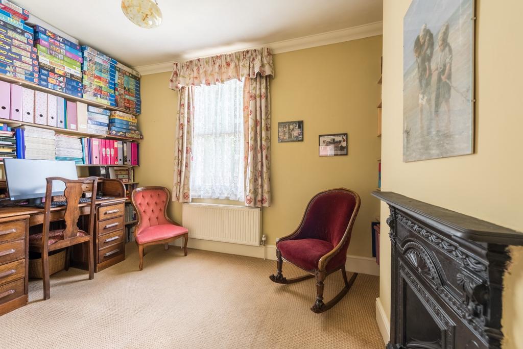 At the top of the stairs, the first door leads to the third bedroom. Currently used as a study, it is easily spacious enough to be a comfortable double room or great children’s bedroom. There’s a period cast iron fireplace and a radiator under the window, which looks out to the rear garden. The walls are painted in a light khaki with fawn carpet to match.