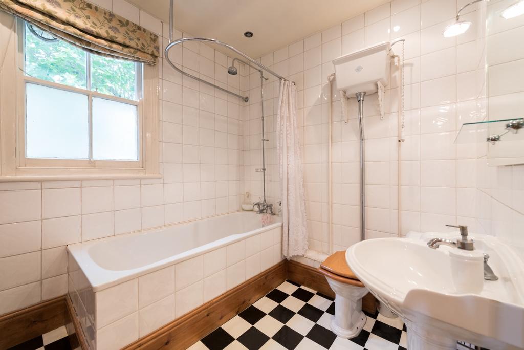 Return to the landing and the next door, on your right, takes you into the large bathroom. This room retains the period feel of the rest of the house, but still has all the features required in a modern family bathroom. The Victorian style three piece suite comprises of a large bathtub with shower above, a WC with wooden seat and high level cistern, plus a large pedestal basin with mirror and lighting above. There’s also a shaver socket and high level inset spotlights. Floor to ceiling white gloss tiles and a traditional black and white check pattern floor complete this elegant bathroom.