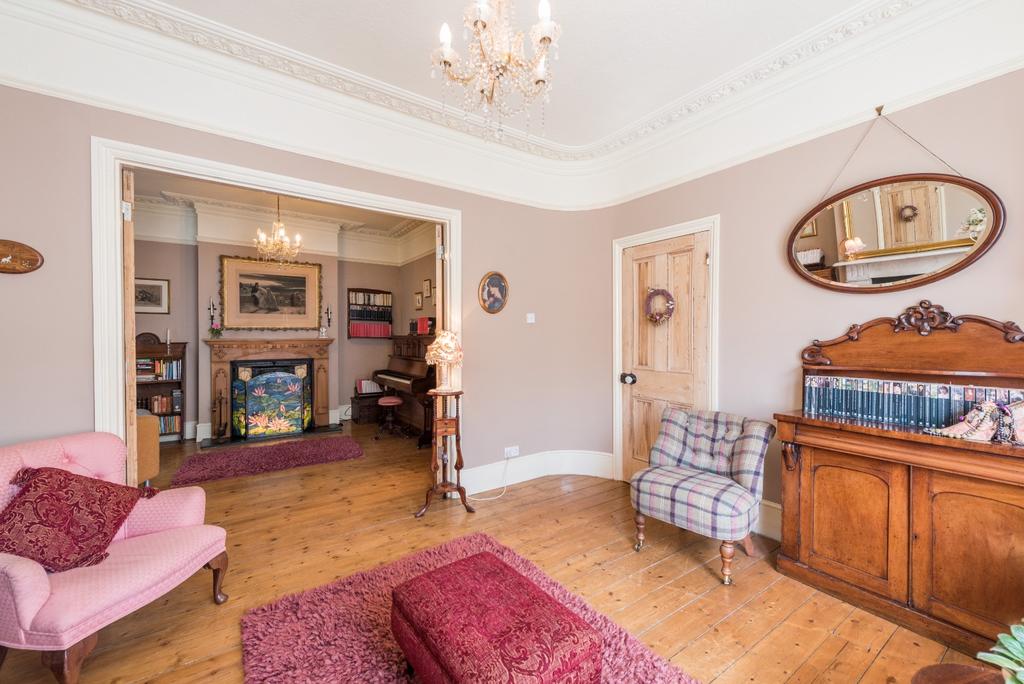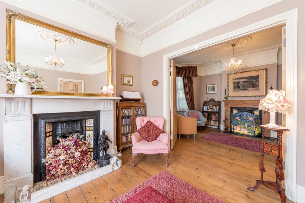 Opening the front door takes you into a space which will create quite the impression on any visitor. The hallway is a generous size with high ceilings, a perfectly chosen chandelier and exquisite ornate cornice, all beautifully lit by the multicoloured stained glass in the front door. There are deep skirting boards and a fluted dado rail which runs the length of the hall and continues up the stairs. There’s plenty of wall space to display your favourite artwork and a radiator to ensure a warm welcome. Where the hallway widens to lead into the rest of the property, it has been formed using a clever convex curved wall, adding a fantastic sense of flow to the space.