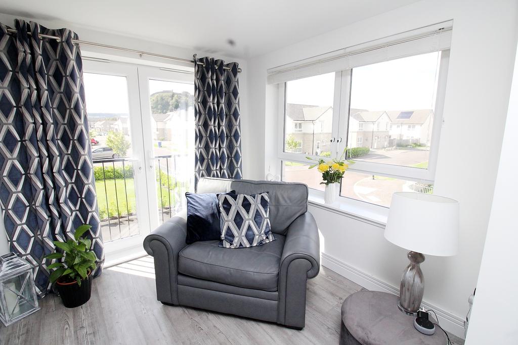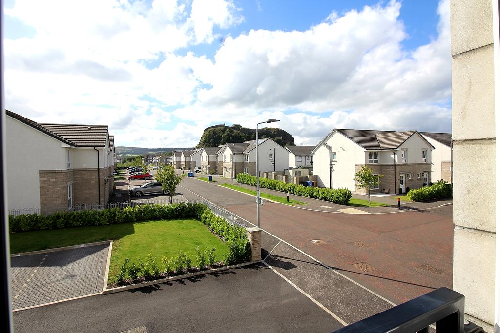 The subjects, being complete with finishes of an excellent standard, are entered via a carpeted residents hallway with security entry system installed. On entering this flatted dwelling, all apartments are entered from a lengthy and bright hallway. A lounge/diner is laid out on an open plan basis with a high quality fitted kitchen that has a full range of branded appliances by ‘Bosch’ and ‘Zanussi’ manufacturers. A particular feature of this generous apartment are corner positioned French doors with a ‘Juliette’ balcony, and windows to the side that provide open southerly and westerly views. Furthermore, internally, accommodation comprises two double sized bedrooms both with fitted storage facilities and one having a good sized en-suite shower room with three piece suite. Also entered from the hallway is a partially tiled bathroom with three piece white suite.