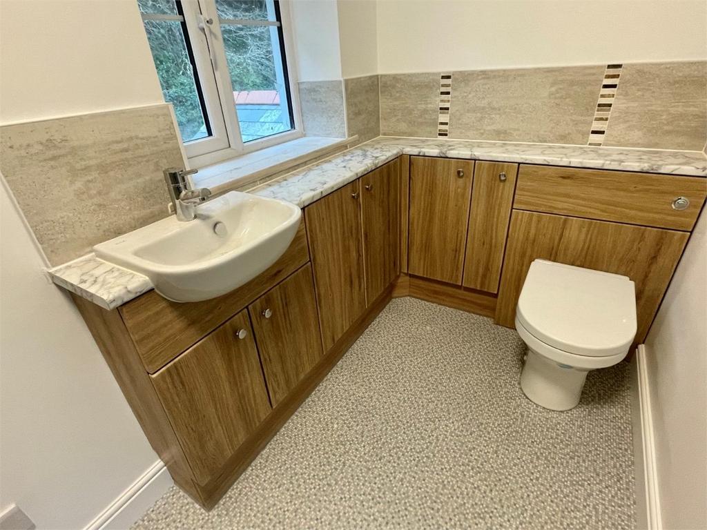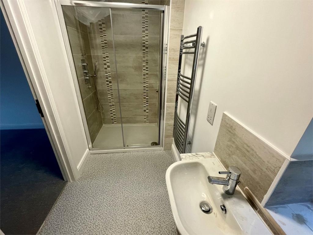 Fitted with a spacious double shower cubical with hand and waterfall shower, wash hand basin with vanity surround incorporating a low level WC with concealed cistern, part tiled walls, heated towel rail, upvc window to rear.