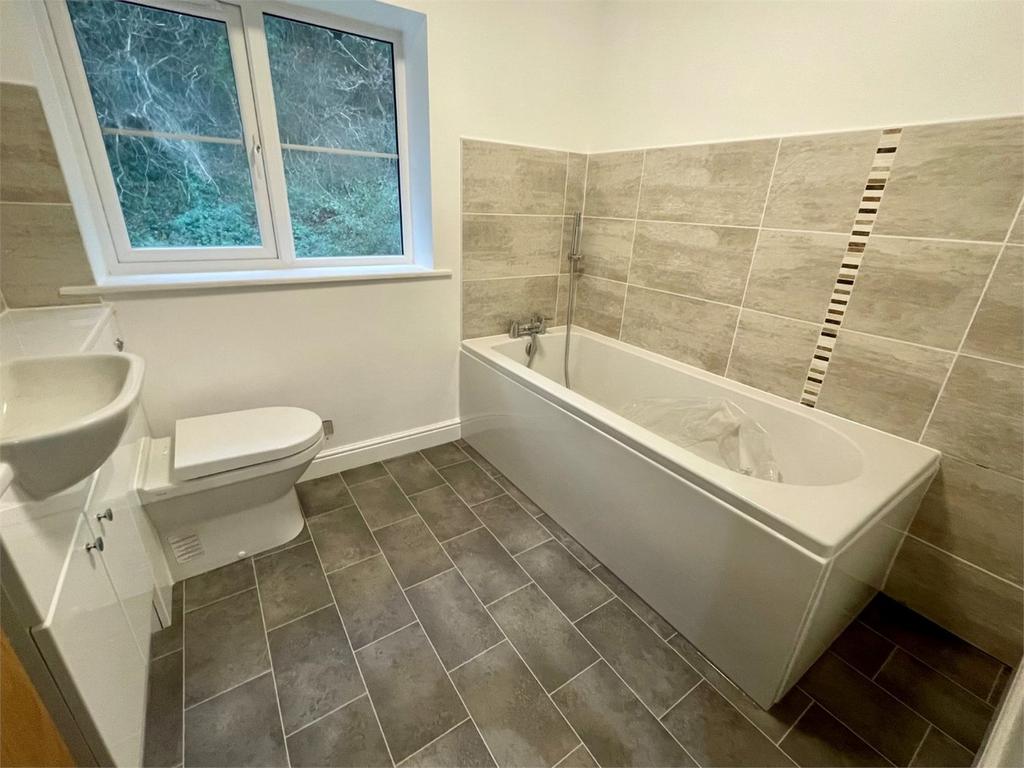 A white suite comprising low level WC, wash hand basin with vanity surround, panel bath with mixer shower attachment, part tiled walls, window to rear, heated towel rail.