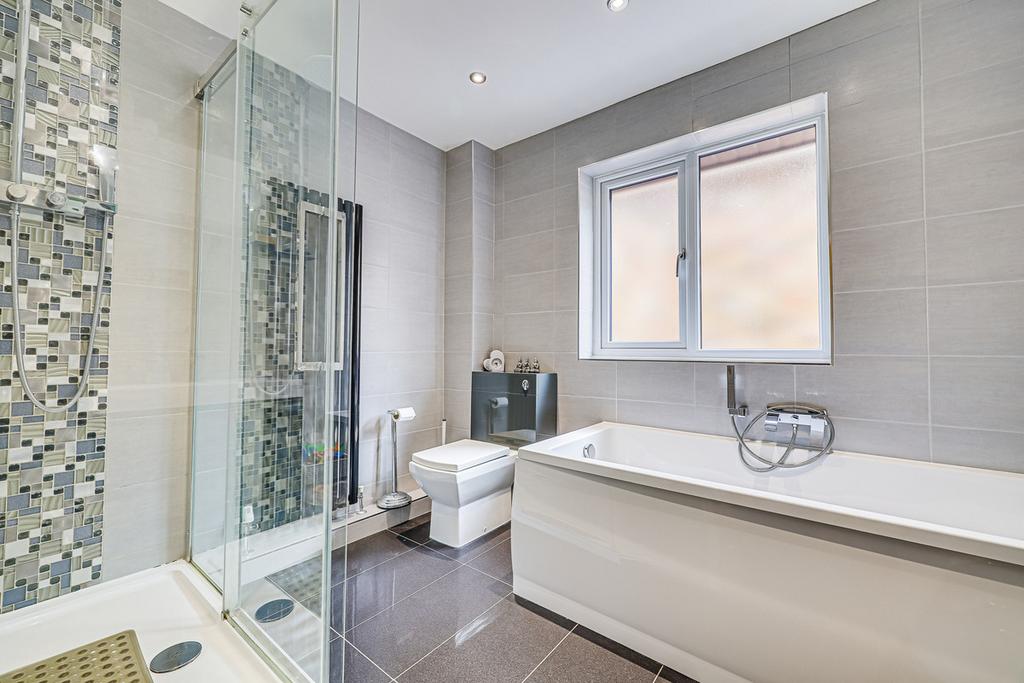 Four piece suite comprising walk in shower cubicle with rainfall shower and handheld shower attachment, panelled bath with handheld shower attachment, wash hand basin with mixer tap set into vanity unit with cupboards below, low level dual flush w/c, double glazed obscure window to side, smooth ceiling with fitted spotlights, wall mounted mirrored cabinet, fully tiled walls, floor to ceiling radiator, tiled flooring.