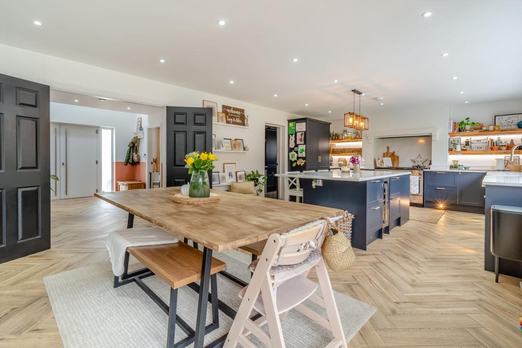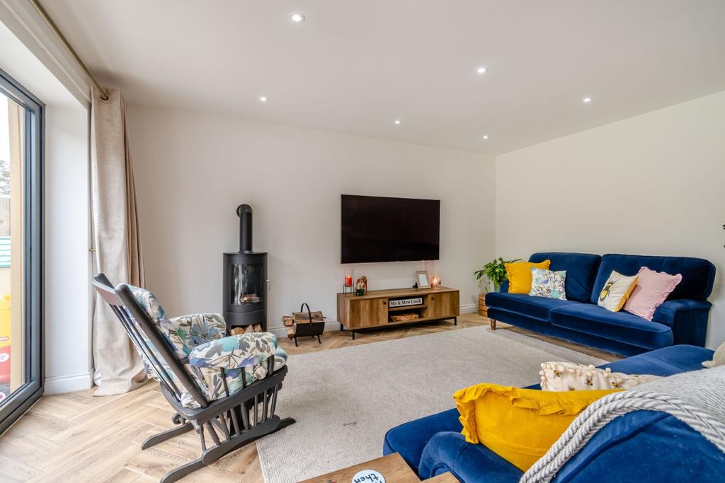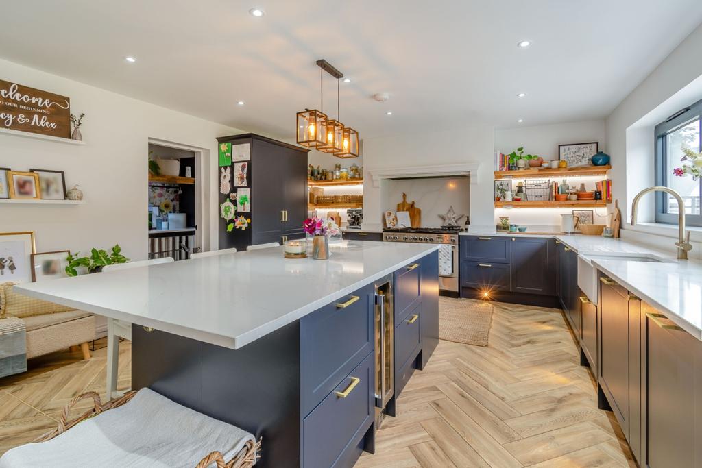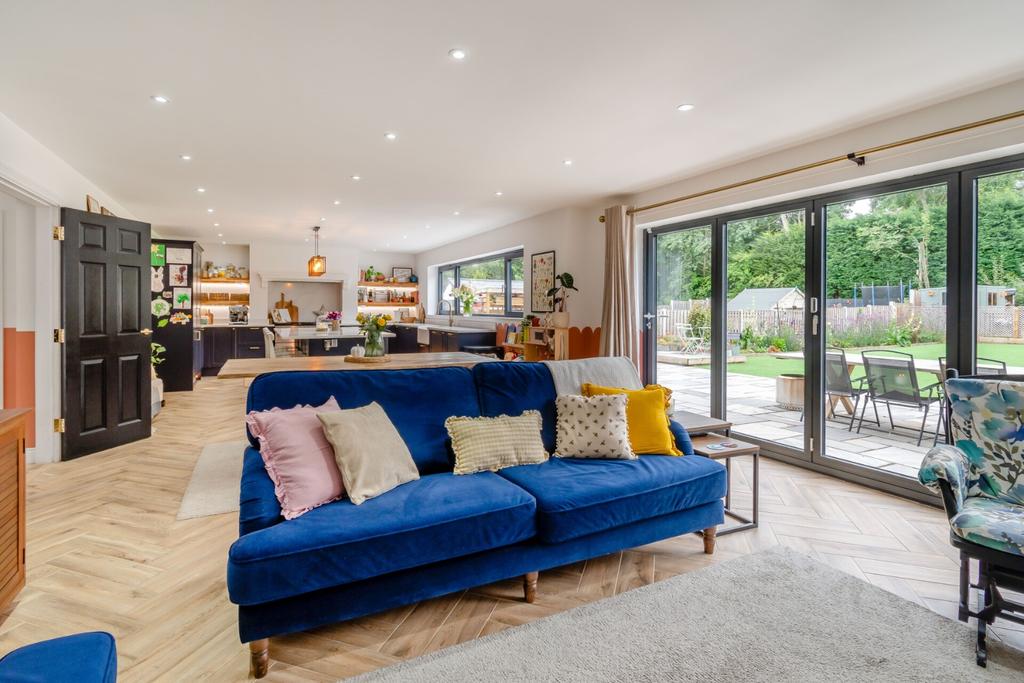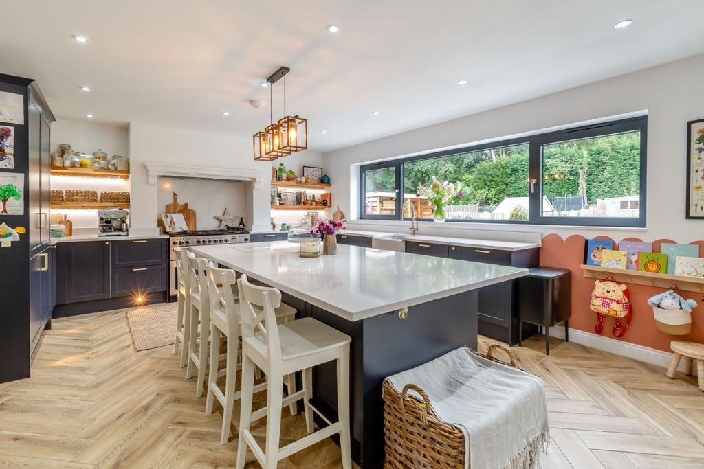 The living kitchen forms the hub of the home, offers exceptional proportions, flooded with natural light, Bi-folding doors opening directly onto a South facing terrace inviting the outdoors inside. The room has a herringbone style, tiled floor and incorporates a kitchen, dining area and lounge. The kitchen presents a comprehensive range of fitted furniture, consisting of base cupboards and drawer units, which sits beneath a Quartz work surface, which has matching up-stands, an inset drainer and a Belfast sink with mixer tap over. A centrally positioned island has a substantial Quartz surface, which extends to a four-seater breakfast bar with useful pan drawers and wine chiller beneath. A complement of appliances includes a Rangemaster stove, which comprises a double oven and grill with a five-ring burner and hot plate, set back into a feature chimney breast with a Quartz splash back and concealed extractor canopy. Additional appliances include a dishwasher, a full height fridge and a full height freezer.