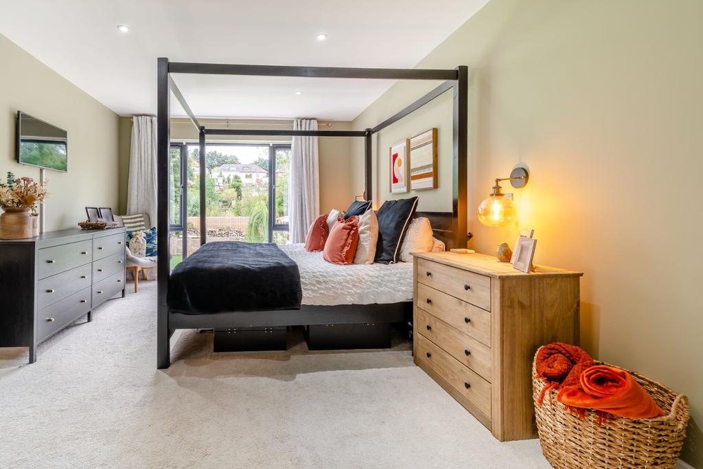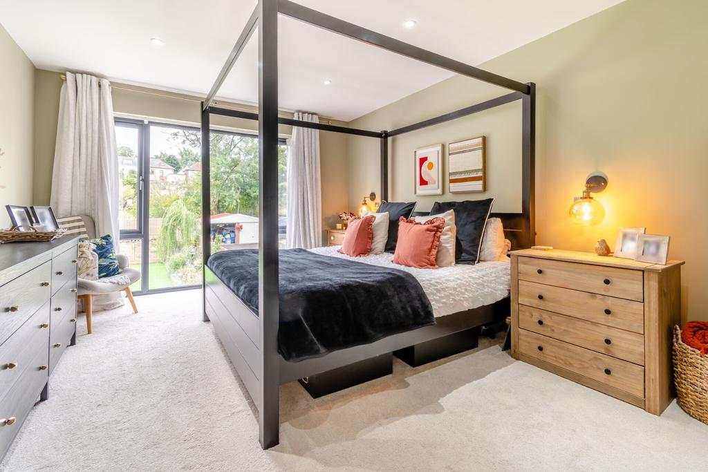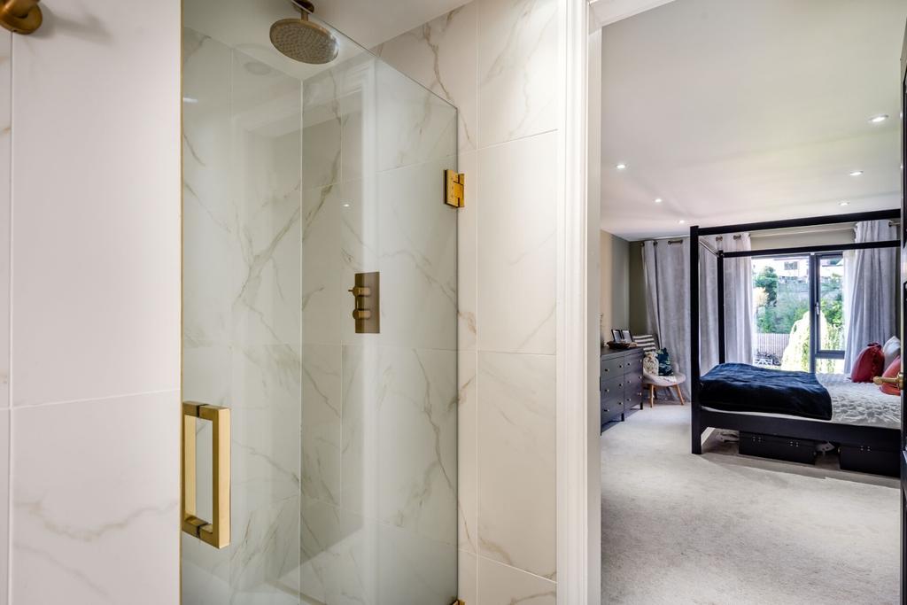 The principal bedroom suite offers exceptional proportions, is positioned to the rear aspect of the home, having full height windows commanding a stunning outlook over the gardens. The en-suite presents a step-in shower, a low flush W.C and twin wash hand basins. The room has complimentary tiling to the walls and floor and two Skylight windows.