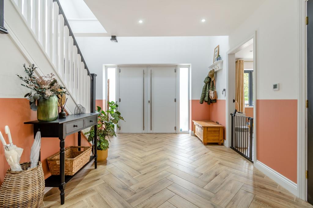 Contemporary style double Composite doors sit between full height windows, opening into the reception hallway which provides an impressive introduction to the home, offering a glimpse through the living kitchen to generous gardens at the rear.