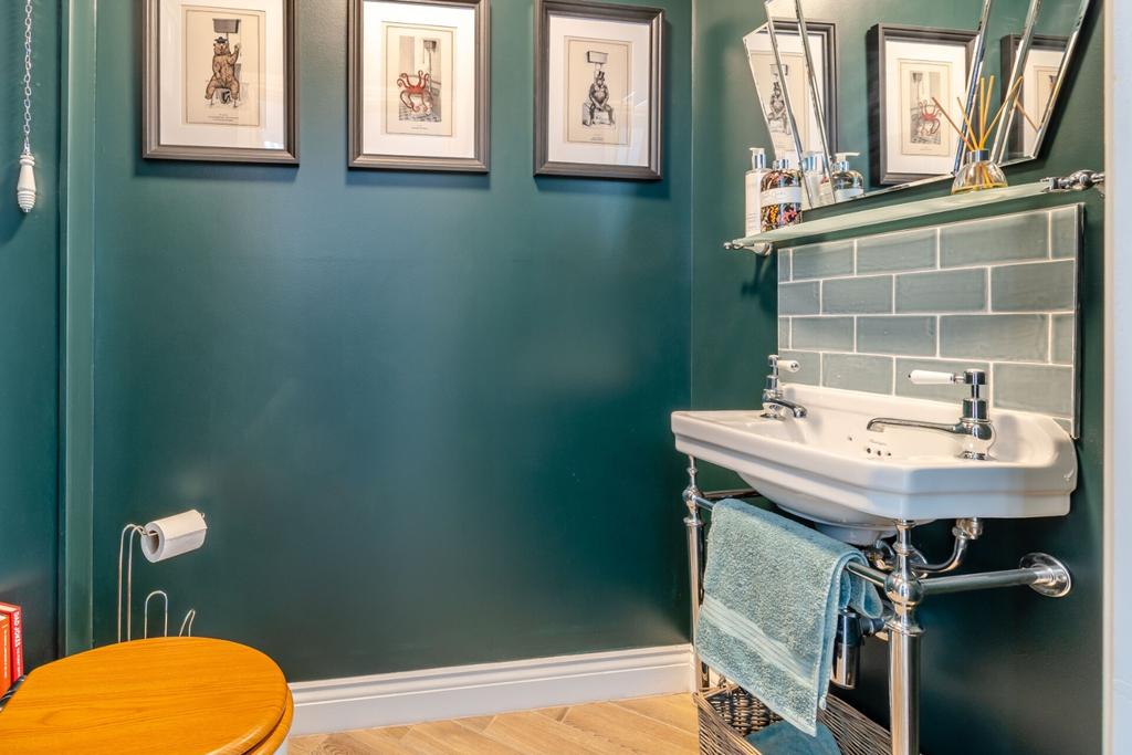 Off the hallway a cloakroom presents a two-piece suite comprising a high flush W.C and a wash hand basin with a tiled splash back.