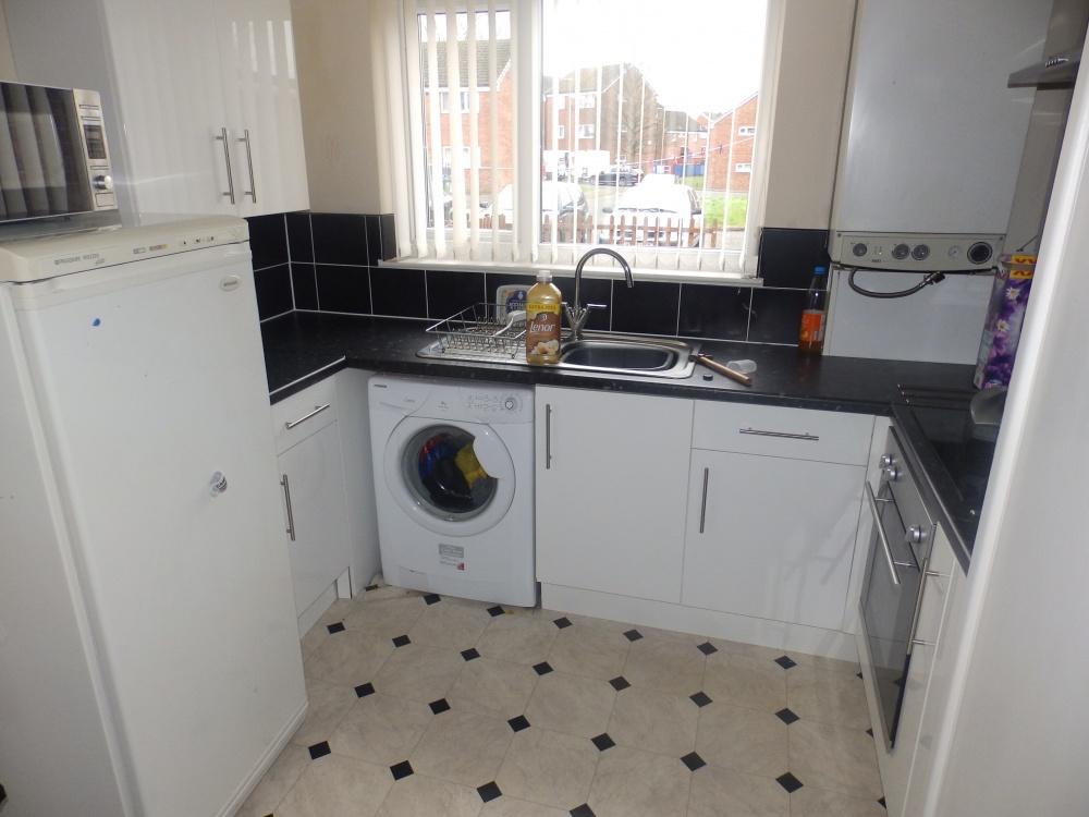 Dining kitchen. Fitted with a range of new white units with conrasting work surfaces. Inset sink unit. Built in electric oven and hob. Window to front aspect. Central heating radiator.