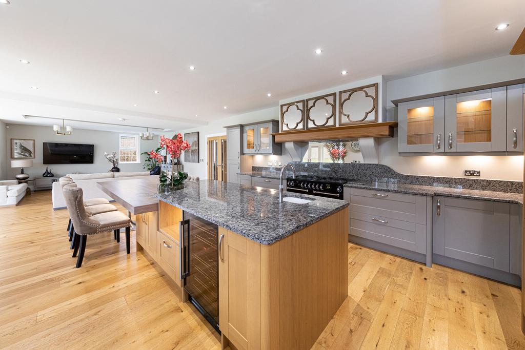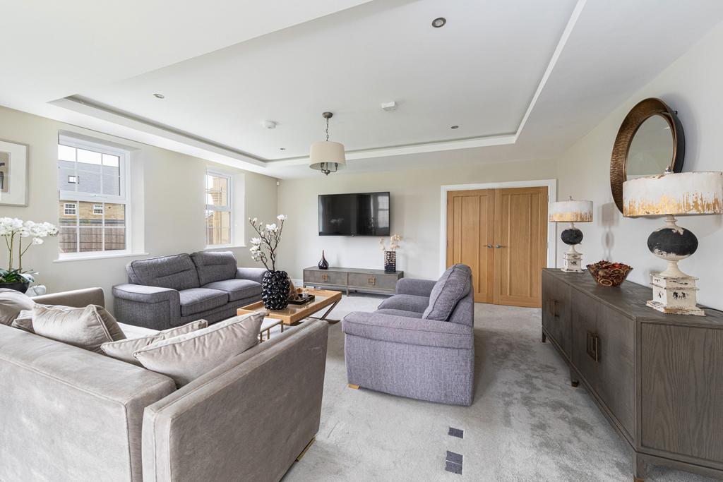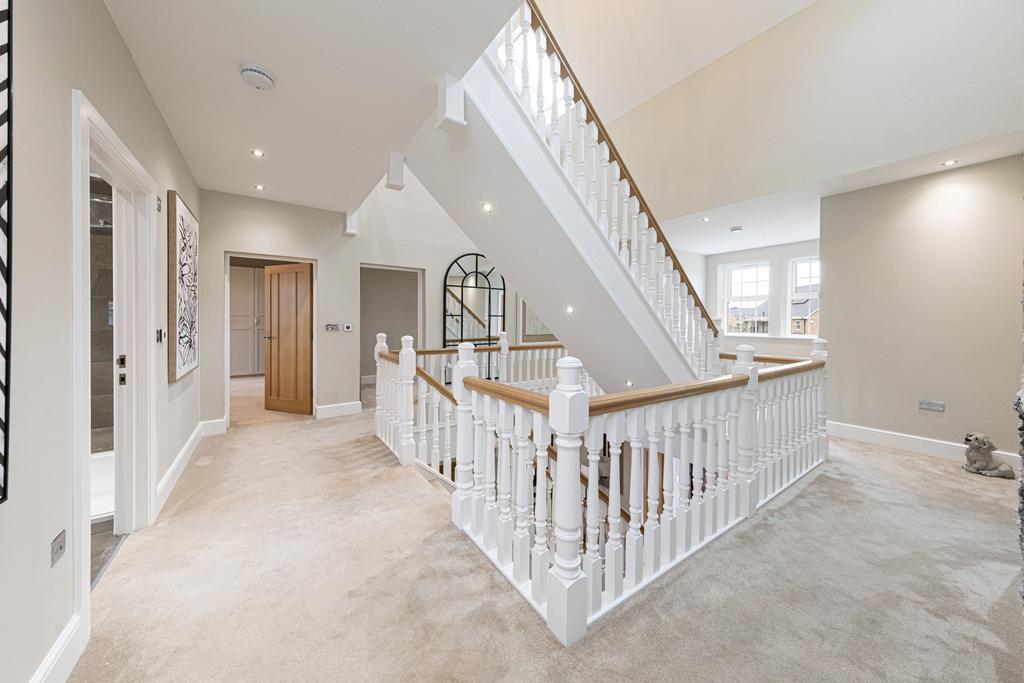 The impressive stone portico entrance with double doors opens to the hall with access to the principal accommodation and staircase to the galleried first floor landing. The sitting room features a gorgeous large bay window. The décor is stylish and contemporary, using clean lines and modern colour palettes with understated prestige along with an eye-catching tray ceiling with subtle illumination. There is further ambient reception space in the elegant drawing room with feature ceiling aggrandisements. The heart of the home is the spectacular open plan kitchen, dining room and garden room which represents the perfect entertaining space for family and guests. A superb range of bespoke cabinetry provide an abundance of storage and work space, whilst also housing high quality integrated appliances. A designer central island flows into a sleek dining table, and beyond this is a vast comfortable sitting area. The whole space is bathed in natural light from the full-height glazing that wraps around the garden room area. French doors sweep open to the patio for indoor/outdoor living on warm summer evenings. The kitchen is served by a utility room with yet more storage, with all units in identical style and high specification as in the kitchen. There is space for white goods and a wonderful adjoining in walk-in pantry. A cloakroom and a separate WC off the main hall complete the ground floor accommodation.