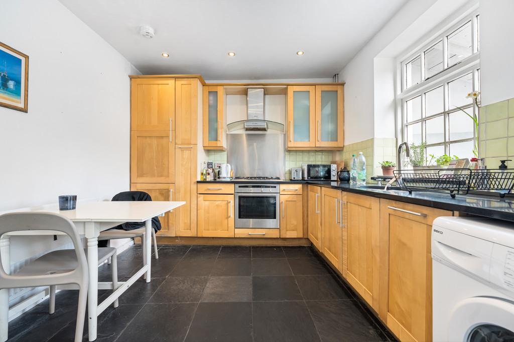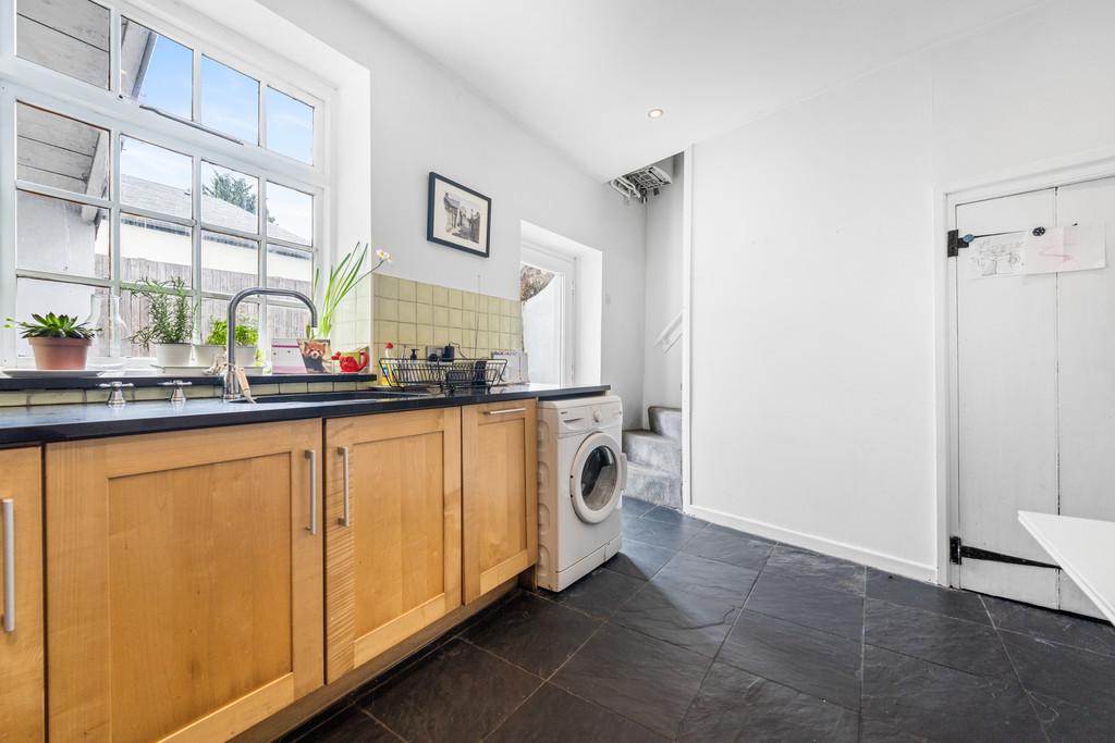 KITCHEN Fully fitted kitchen with a range of wall, base and drawer units with worktops over incorporating five ring gas hob with oven below and extractor above, and stainless steel sink with hot and cold tap over. Tiled splashbacks. Integrated appliances such as fridge freezer and dishwasher. Space for washing machine. Power points. Tiled flooring. Radiator. Door to under stair storage cupboard. Window to rear. Spotlights. Double-glazed door leading to rear garden. Stairs rising to first floor.