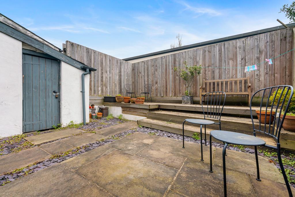 OUTSIDE Rear - Larger than average garden. Laid to patio with additional shingled areas. Outside storage shed. Decking to far end. Part fence, part wall border.