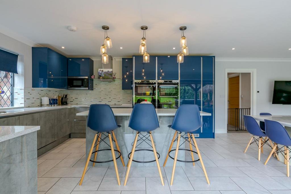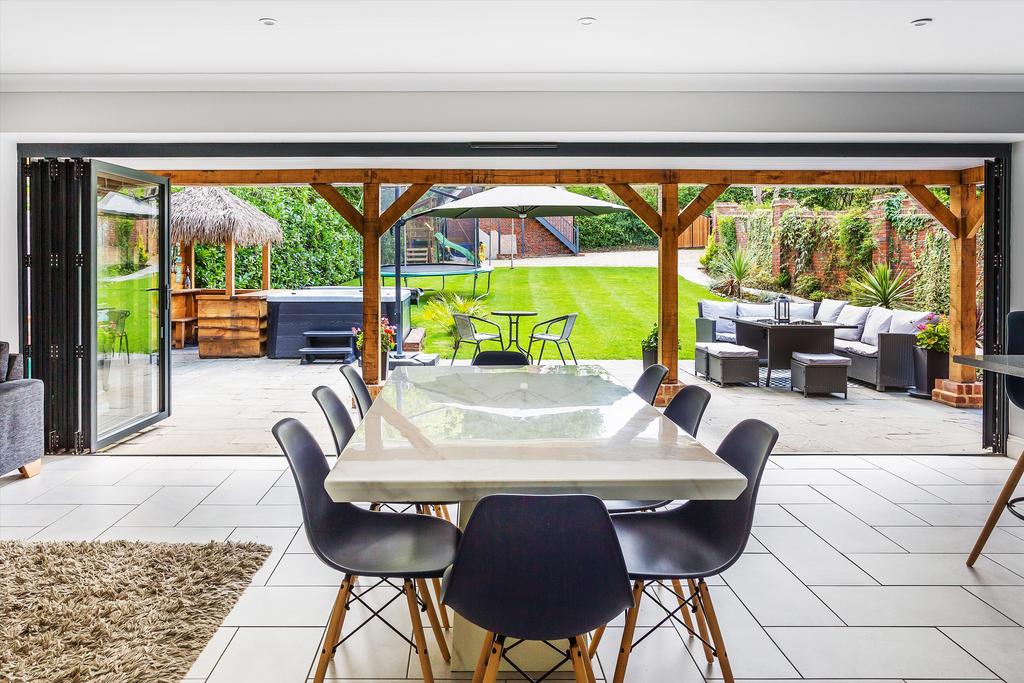 Oak House is set back from the private road with a large, gravelled driveway. The property sits behind attractive electric gates and has a double garage with a home office/ study above it. The garden has been immaculately landscaped, with a wraparound sun-terrace with a hot tub and outside bar in one corner. The terrace neatly leads onto the flat and well-manicured lawn which is southeast-facing and enjoys sun-light for the majority of the day. One of the properties boundaries is bordered by an array of matures trees and the other by an attractive red-brick wall. This helps create a great sense of privacy.