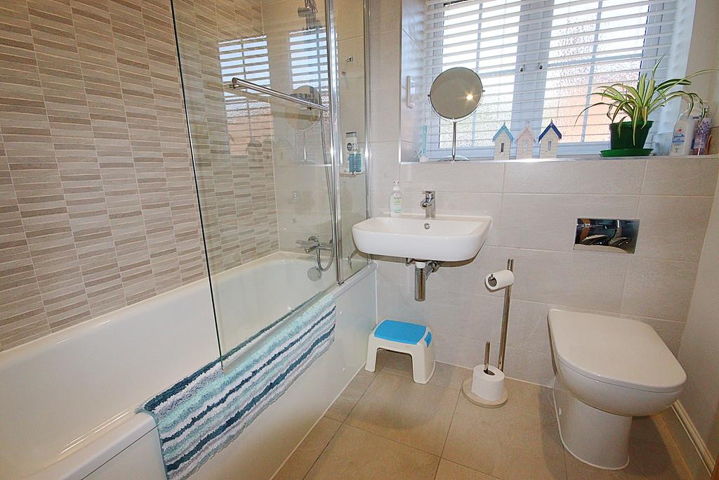White suite comprising: panelled bath with mixer tap and shower attachment and fitted glazed shower screen, wash hand basin with mixer tap, concealed cistern w.c., deep tiled sill, chrome heated towel rail, tiled floor, part tiled walls, double glazed window with fitted venetian blind, shaver point, extractor, recessed spot lights.