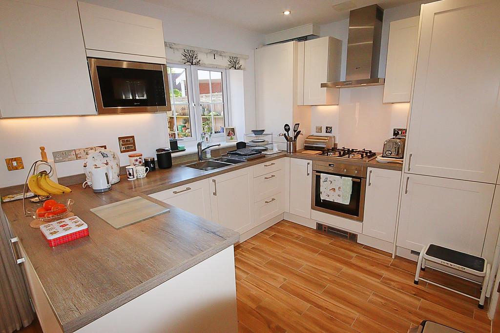 Running the full width of the property with the dining area having tiled floor, radiator, double glazed windows, and a double glazed door leading out onto the garden. The kitchen is extensively fitted and comprises: worksurface with inset stainless steel one and a half bowl sink unit with base cupboards and drawers under, integrated dishwasher, further matching worksurface with inset gas hob, glass splash back and stainless steel extractor, integrated oven with base cupboards to either side, integrated fridge/freezer, peninsula worksurface with fitted integrated washer/dryer beneath, wine cooler, additional base cupboard to rear, several eye-level cupboards, integrated microwave, concealed gas fired boiler, tiled floor, double glazed window, spot lights.
