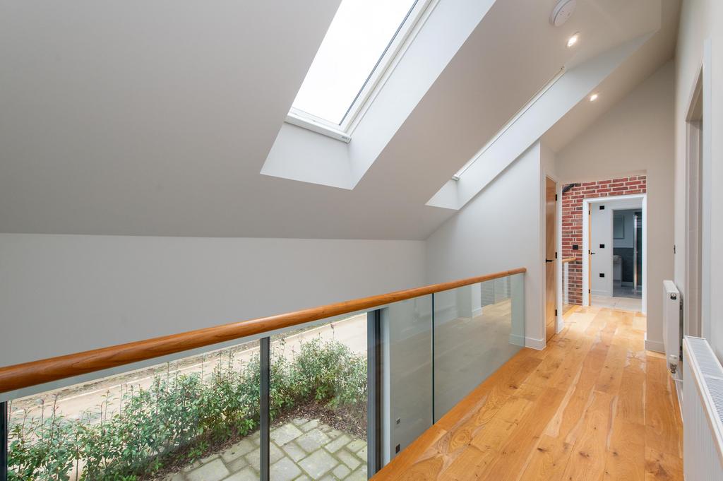The staircase in the glazed link rises to the gallery landing, off which are three generous bedrooms, a bathroom and an en suite shower room with high-quality sanitary ware and tiling.