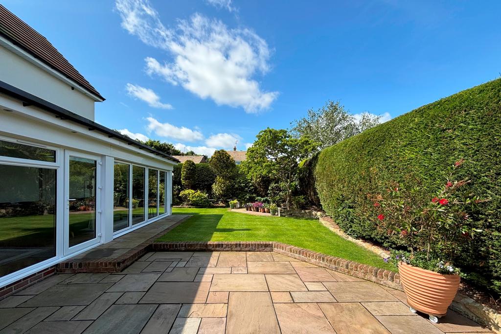 PRIVATE GARDENS: to the front, there is a large block paved driveway providing off road vehicle standage for numerous vehicles accessed via remote controlled wrought iron gates, outside lights, covered illuminated log store with door to garage, external power points, gate providing access to lawn, borders and tap for hosepipe. The side and rear garden have a large stone paved patio, shaped lawn & borders with well established planting, mature hedge which surrounds the perimeter providing privacy and seclusion, external power points, security sensor light, 2nd paved patio and dual, sunny aspects to both the South and West.