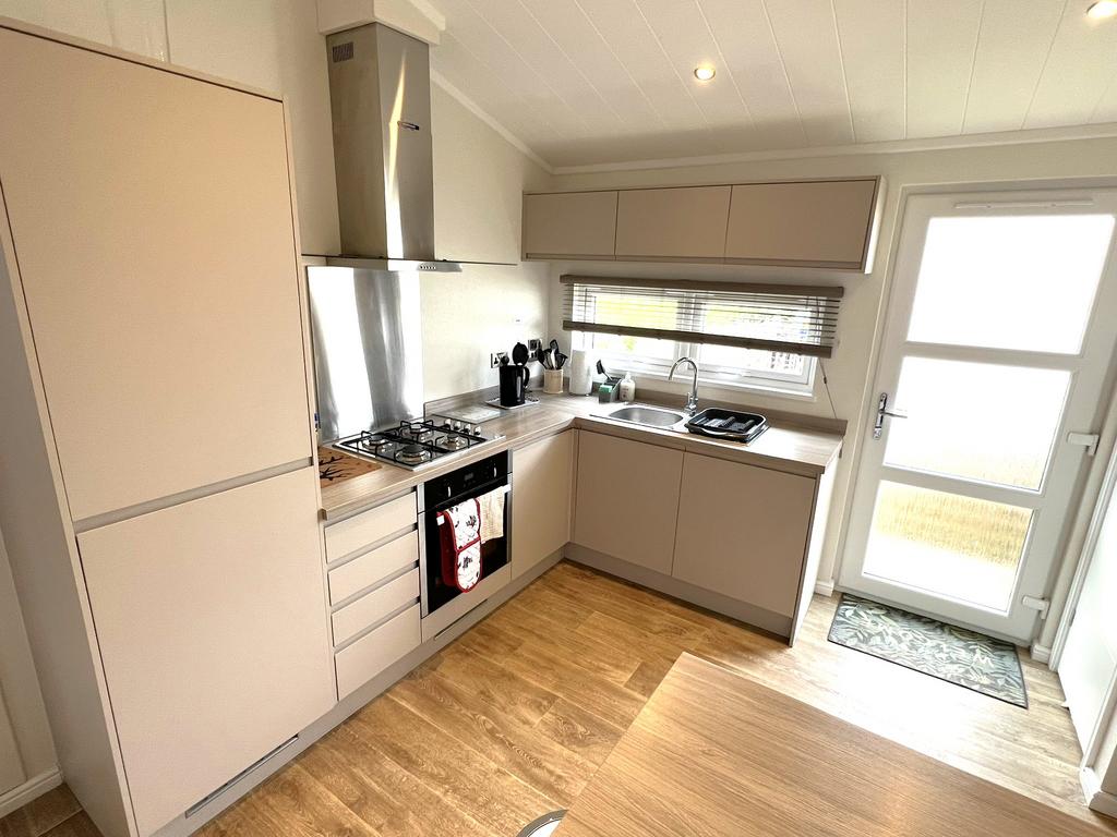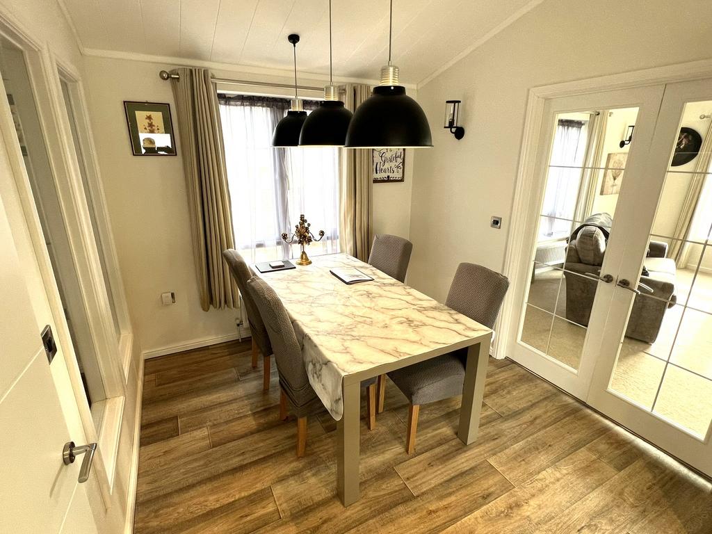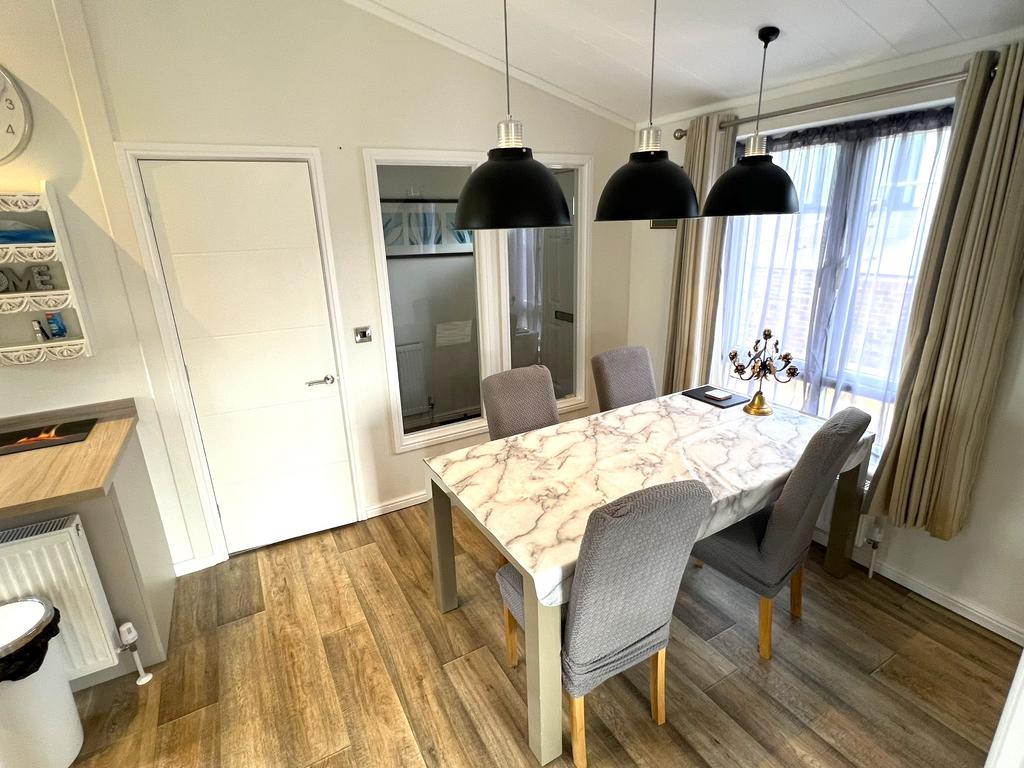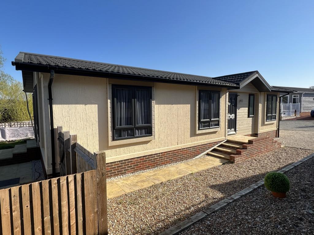 Description: Casa Van is situated on the Rother Valley Caravan Park set back from Station Road the property is sited in a quiet pleasant location with access over a gravel driveway providing off street parking for two cars. The property is accessed via four brick steps leading up to a central front door, which opens into an “L “Shaped entrance hallway, with built in coat cupboard. A glazed door leads from the entrance hall into an open plan kitchen / dining room with fully fitted kitchen area with an off grey, shaker style units with laminate worktops, stainless steel sink and drainer, gas hob, oven below and extractor hood. There is also an integrated dishwasher, fridge / freezer and washer / dryer along with a good range of kitchen units. A glazed door leads from the kitchen out to the rear garden while at the opposite end is a front facing window and connecting French doors leading through to a generous large living room benefiting from a feature wall with electric fireplace and double aspect windows including French doors opening out to a paved garden area.