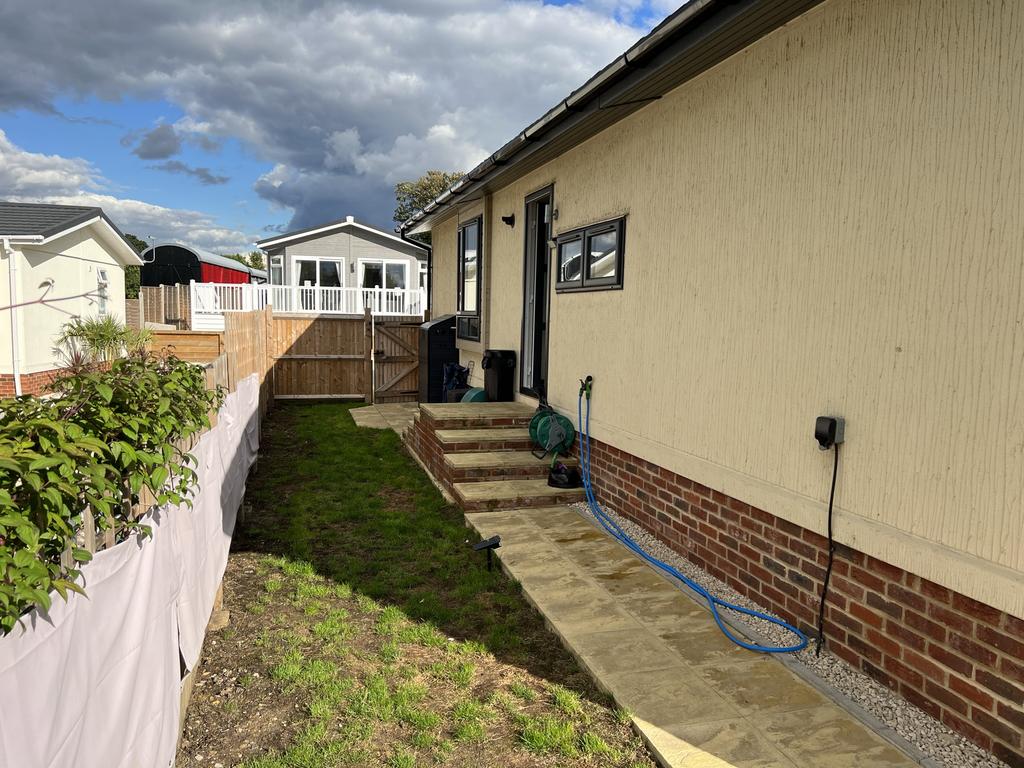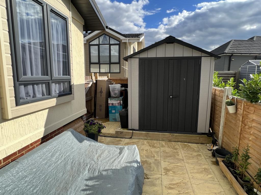 Externally the park home benefits from 2 car parking spaces at the end of the property with a gravel covered front garden leading pass the entrance steps to a side gate that leads through to a paved west facing rear terrace accessed from the living room with a large garden store shed in the corner. A connecting lawn garden runs along the back of the property with a side gate opening back onto the parking area.