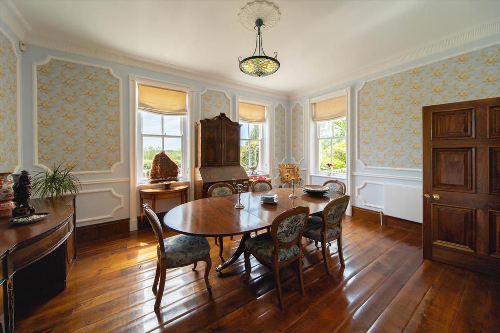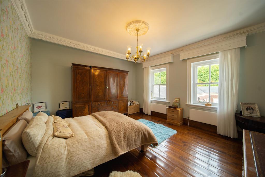 A double aspect room with ceiling cornice and wall mouldings. 3 sash windows with views over parkland gardens. Polished strip wood floor. 2 radiators.